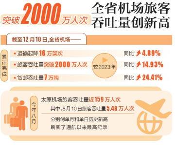 做足“增量篇”,各項(xiàng)生產(chǎn)指標(biāo)再創(chuàng)新高。今年以來,山西航產(chǎn)集團(tuán)乘勢而上,統(tǒng)籌發(fā)展,三大民航運(yùn)輸生產(chǎn)指標(biāo)屢創(chuàng)新高。截至12月10日,全省機(jī)場累計(jì)完成運(yùn)輸起降16萬架次、旅客吞吐量突破2000萬人次、貨郵吞吐量7萬噸,較2023年同比增長4.89%、14.93%、24.41%。尤其是在今年8月,太原機(jī)場旅客吞吐量近159萬人次,其中8月10日旅客吞吐量5.48萬人次,分別創(chuàng)單月和單日歷史新高,刷新了通航以來最高紀(jì)錄。