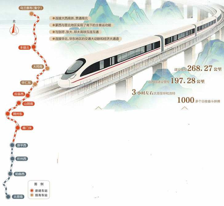 集大原鐵路鑄造了一個(gè)嶄新的鐵路“增強(qiáng)版”:連接大西高鐵,貫通南北,山西和內(nèi)蒙古兩地交流打通了快速通達(dá)重要通道,蒙西與晉北地區(qū)實(shí)現(xiàn)了南下的主客運(yùn)功能,烏蘭察布、大同和太原鐵路樞紐地位得以強(qiáng)化和提升。