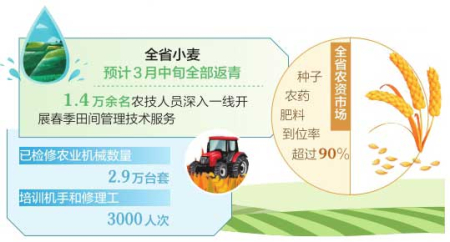 全省農(nóng)資市場備貨充足,價(jià)格穩(wěn)中有降。目前,種子、農(nóng)藥、肥料到位率超過90%。全省已檢修農(nóng)業(yè)機(jī)械數(shù)量2.9萬臺(tái)套,培訓(xùn)機(jī)手和修理工3000人次。