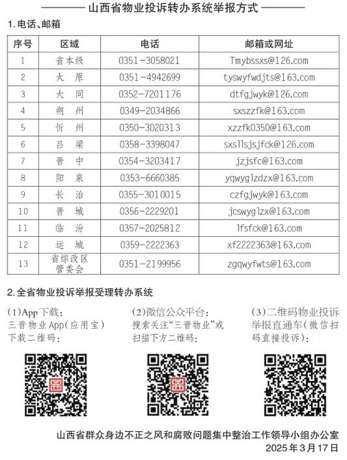 近日,省集中整治辦聚焦“整治物業(yè)服務(wù)不履約不到位、侵占業(yè)主利益等問題并建立完善物業(yè)企業(yè)退出機(jī)制”實(shí)事項(xiàng)目,推動(dòng)省住建廳打造了“山西省智慧物業(yè)管理服務(wù)平臺(tái)暨全省物業(yè)投訴轉(zhuǎn)辦系統(tǒng)”,實(shí)現(xiàn)線上投訴、一鍵受理、銷號(hào)審核和督辦匯總等功能,省市縣三級(jí)一體化運(yùn)行,該系統(tǒng)已正式上線運(yùn)行。為廣泛聽取群眾意見,全面受理群眾投訴,接受群眾監(jiān)督,現(xiàn)將全省各地電話、郵箱、“三晉物業(yè)”二維碼等物業(yè)投訴舉報(bào)渠道向社會(huì)公布如圖。