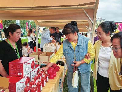 臺上歡歌快舞慶豐收,臺下熱熱鬧鬧逛大集。產(chǎn)品展銷現(xiàn)場,人頭攢動、熱鬧非凡,游客品嘗豐收美食、體驗(yàn)豐收喜悅。售賣農(nóng)產(chǎn)品的農(nóng)民嗓門大、笑容甜:“郊區(qū)西南舁的蘋果,嘎啦脆,您嘗嘗!”“平定的黃瓜干,好吃,有嚼勁!”“今天剛從地里摘的老南瓜,又糯又甜!”“家里走地雞下的蛋,特別香!”