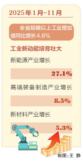 數(shù)據(jù)顯示,2025年1月—11月,全省規(guī)模以上工業(yè)增加值同比增長4.6%,工業(yè)新動能培育壯大,新能源產(chǎn)業(yè)增長27.1%,高端裝備制造產(chǎn)業(yè)增長8.5%,新材料產(chǎn)業(yè)增長5.3%,為全省經(jīng)濟發(fā)展提供了堅實支撐。