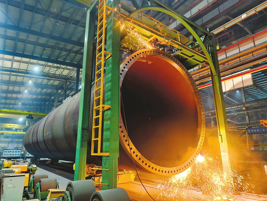 1月19日,在省級裝配式建筑產(chǎn)業(yè)鏈“鏈核”企業(yè)山西鋼構科工有限公司智能制造車間內(nèi),一臺巨型壓力容器正進行焊接作業(yè)。輥道與龍門架穩(wěn)穩(wěn)托舉著數(shù)十米長的鋼構件,自動化系統(tǒng)實時監(jiān)測焊縫質(zhì)量,全力保障昔陽、陽曲、廣靈、屯留等地風電項目塔筒制作。 賈曉瑞 王宇攝