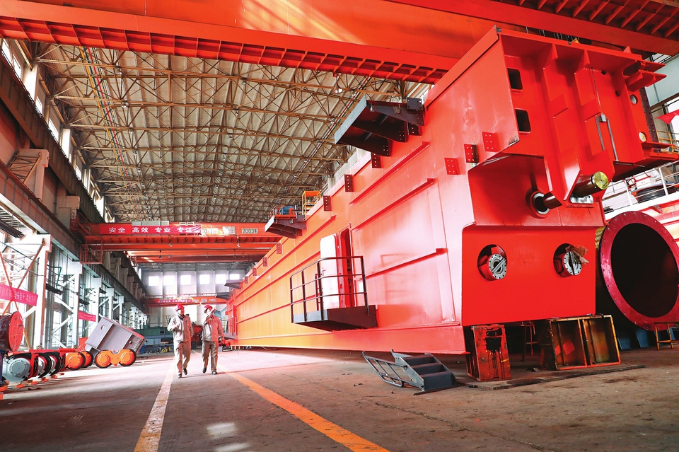 太重集團起重機分公司車間,即將發(fā)往印度AMNS公司的450t鑄造起重機正在進行拆車包裝作業(yè)。武劍峰攝
