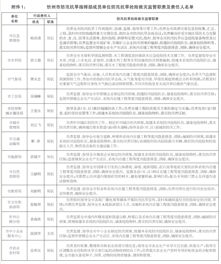 1.忻州市防汛抗旱指揮部成員單位防汛抗旱搶險救災監(jiān)管職責及責任人名單