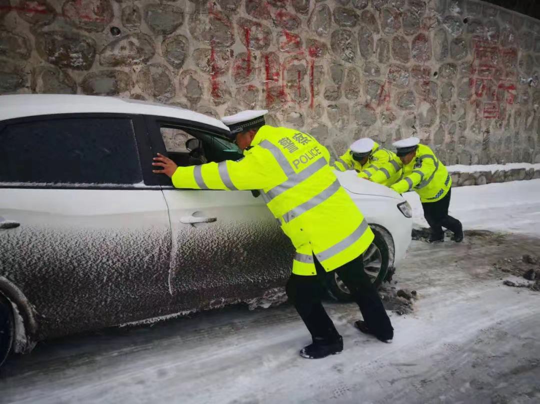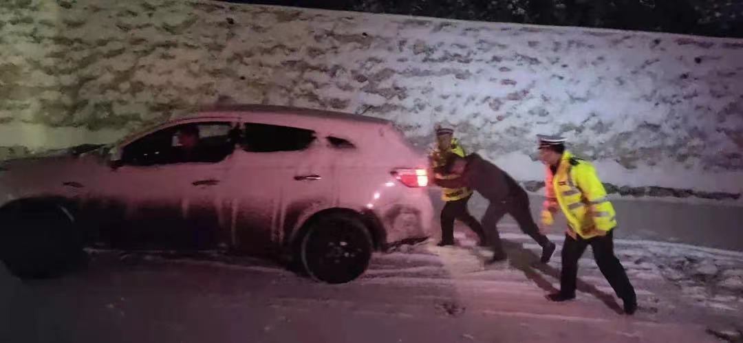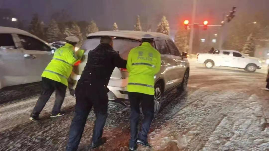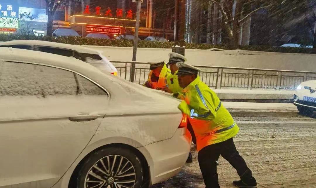 神池縣境內(nèi)夜間道路積雪較厚,澗口坡路段車輛打滑被困,安全股和龍泉中隊(duì)執(zhí)勤民輔警協(xié)助推車,全力保障人們出行平安