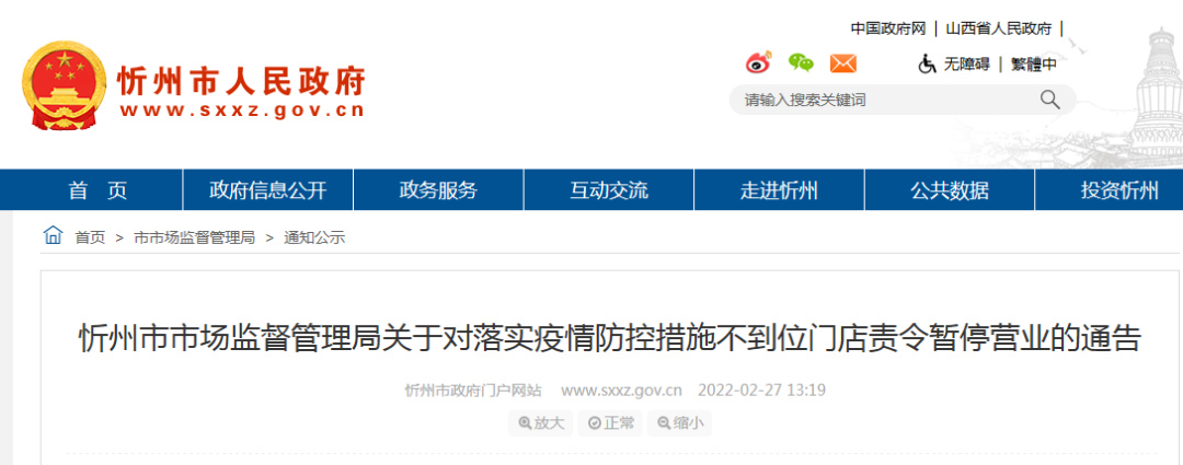 2月23日以來,忻州市市場監(jiān)督管理局落實省市疫情防控專題會議精神,對忻府區(qū)范圍內(nèi)商場、超市、賓館、酒店、藥店等經(jīng)營場所的疫情防控落實情況進行督查檢查,發(fā)現(xiàn)個別門店落實疫情防控措施不到位,責令暫停營業(yè)。通告名單如下: