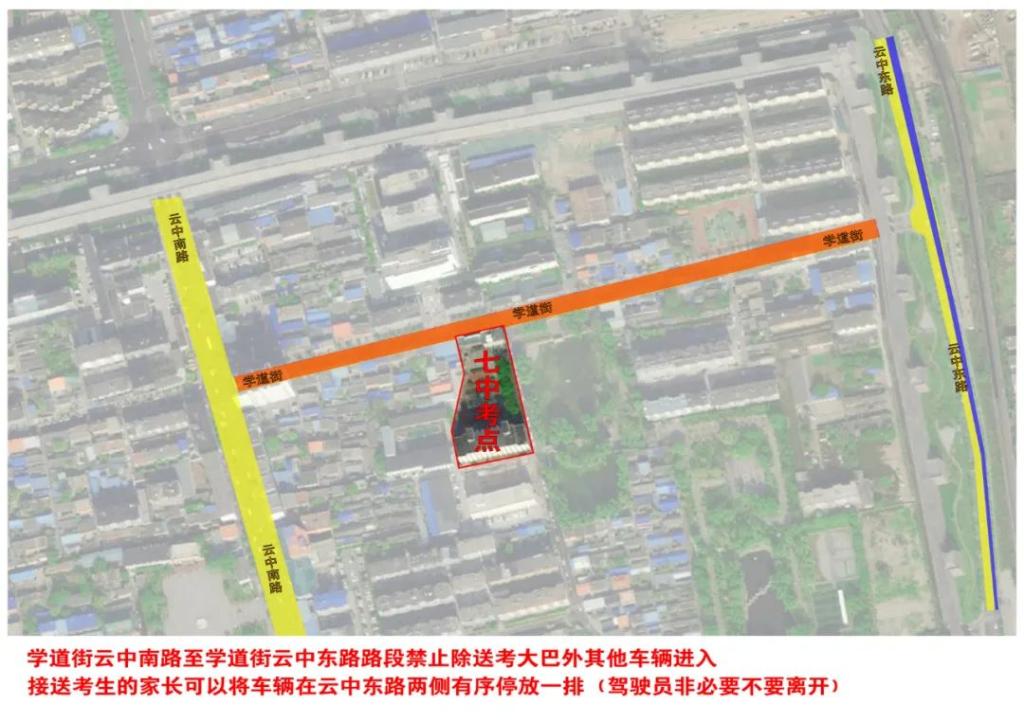 學(xué)道街(云中路至云中東路)禁止除接送考生大巴車(chē)以外的其他車(chē)輛駛?cè)耄缆纺蟼?cè)允許接送考生大巴車(chē)有序停放一排。