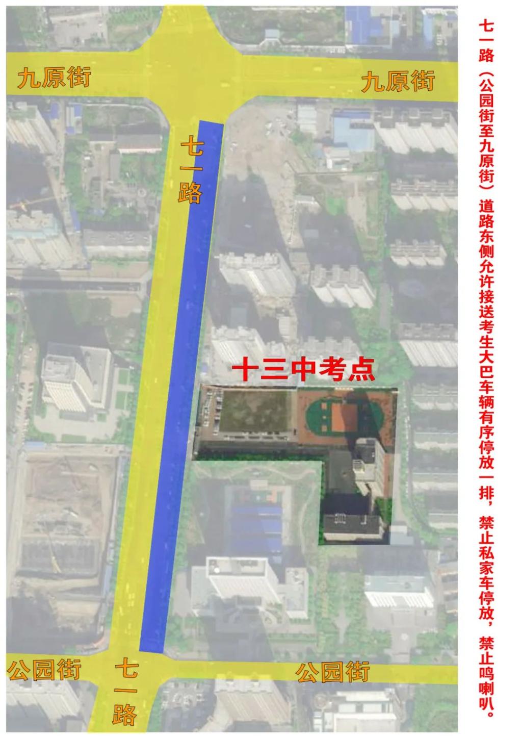 七一路(公園街至九原街)道路東側(cè)允許接送考生大巴車(chē)輛有序停放一排,禁止私家車(chē)停放,禁止鳴喇叭。