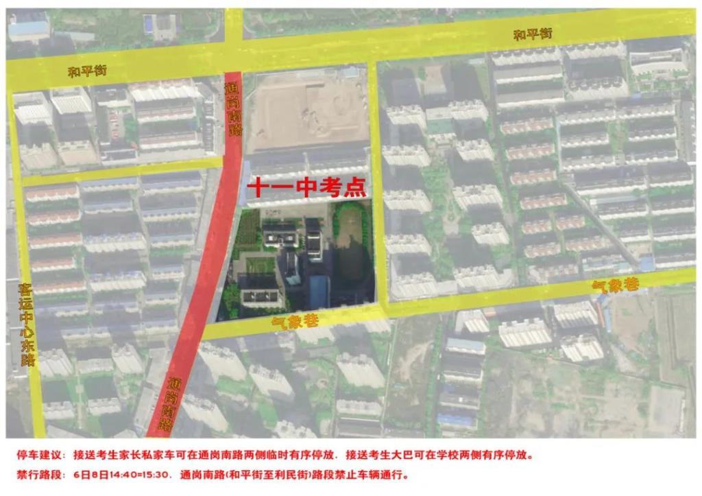 和平街(七一路至新建路)道路北側(cè)禁止一切車(chē)輛停放,道路南側(cè)允許接送考生大巴車(chē)輛有序停放一排。