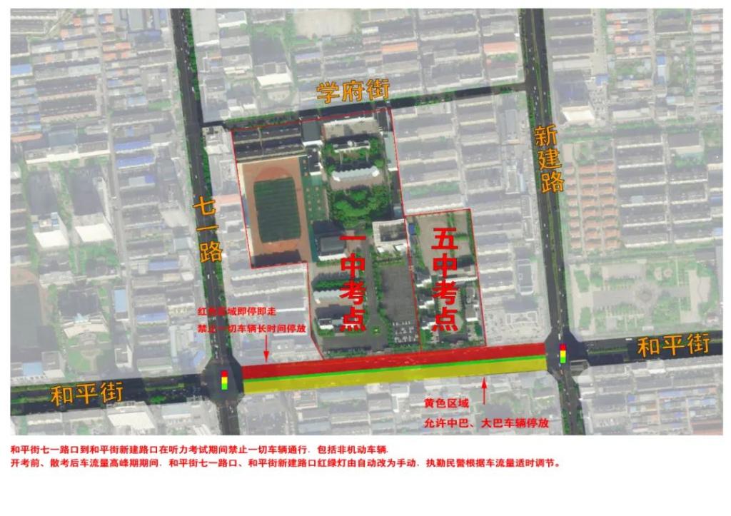 英語(yǔ)聽(tīng)力考試期間,和平街(七一路至新建路)道路兩側(cè)封閉,實(shí)行交通管制,禁止一切車(chē)輛東西通行,禁止鳴喇叭。