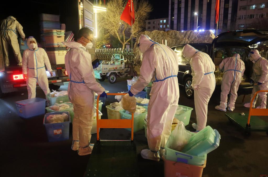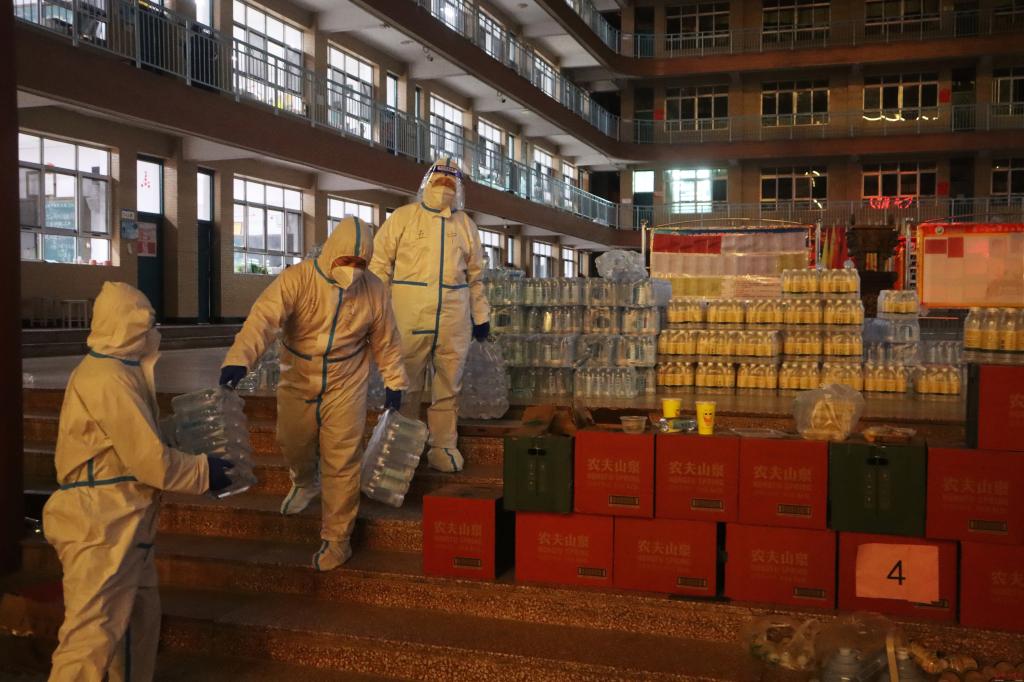 “同學(xué)們,晚餐到了。”晚上6點半,忻州一中3號宿舍樓前走來了“大白”的身影。由老師們組成的送餐隊伍手推餐車走向宿舍樓前,再按照順序為宿舍樓的同學(xué)們依次分發(fā)食物。當(dāng)日的運送的物品除充足的盒飯外還有礦泉水、衛(wèi)生紙等生活用品。