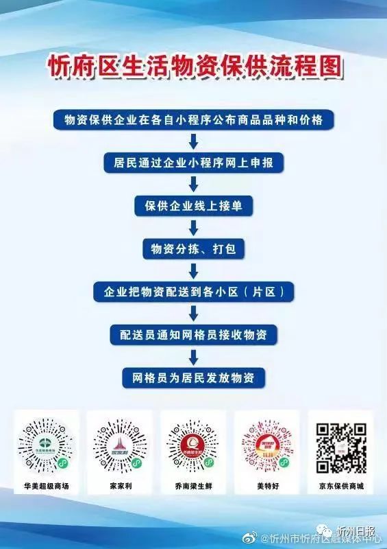 本輪疫情發(fā)生以來,忻府區(qū)精準施策,全力抓好糧油、肉類、禽蛋、蔬菜等居民基本生活物資供應,以快速到戶到家為目標、以解決配送“最后一米”問題為重點,迅速建立貨源組織、分揀包裝、物資配送和到家到戶的供應鏈,并加強健全完善“配送企業(yè)+街道社區(qū)+居民住戶”的“三方對接機制”,推行線上訂貨下單、線下統(tǒng)一配送、居家無接觸購物配送模式,實行保供企業(yè)線上接單、分揀、打包、配送,鄉(xiāng)鎮(zhèn)(街道)網(wǎng)格員接單配送到戶的運行機制,確保全區(qū)居民基本生活需求供應保障到位。