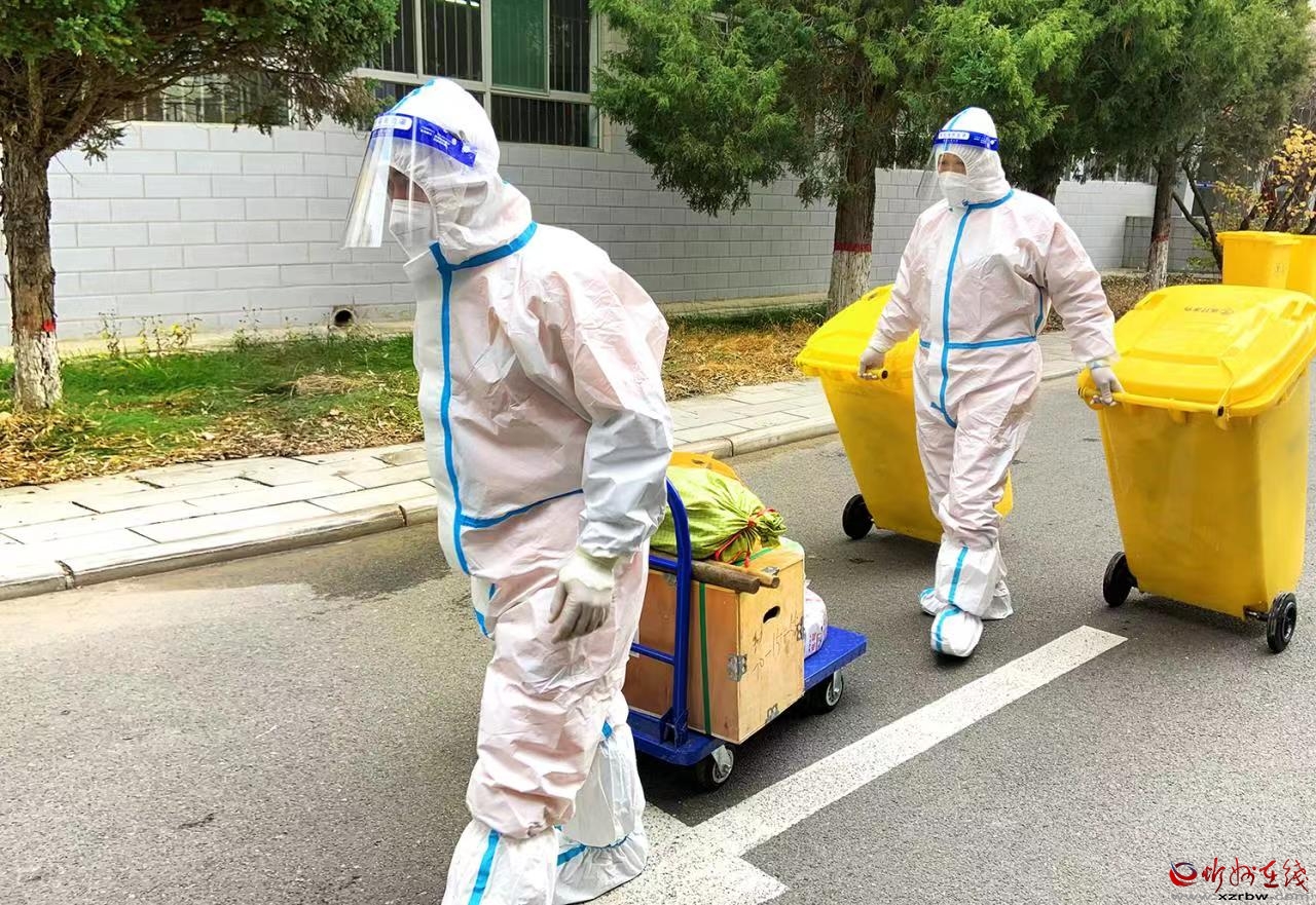 一場清潔下來,他們沒人喊累叫苦,只是在意自己的防護服有沒有破損,在“疫”線能不能堅持得更久,不希望因為自己的疏忽給其他人帶來余外的工作量。負責指揮部衛(wèi)生的李文深師傅,他和搭檔每天5點30分同樣起床開始清理工作區(qū)的生活垃圾,打掃樓道、衛(wèi)生間和室外環(huán)境,保持工作區(qū)干凈衛(wèi)生。他們還要在上午9點前,一起把前一天的生活垃圾搬上垃圾車,及時轉運消除風險。