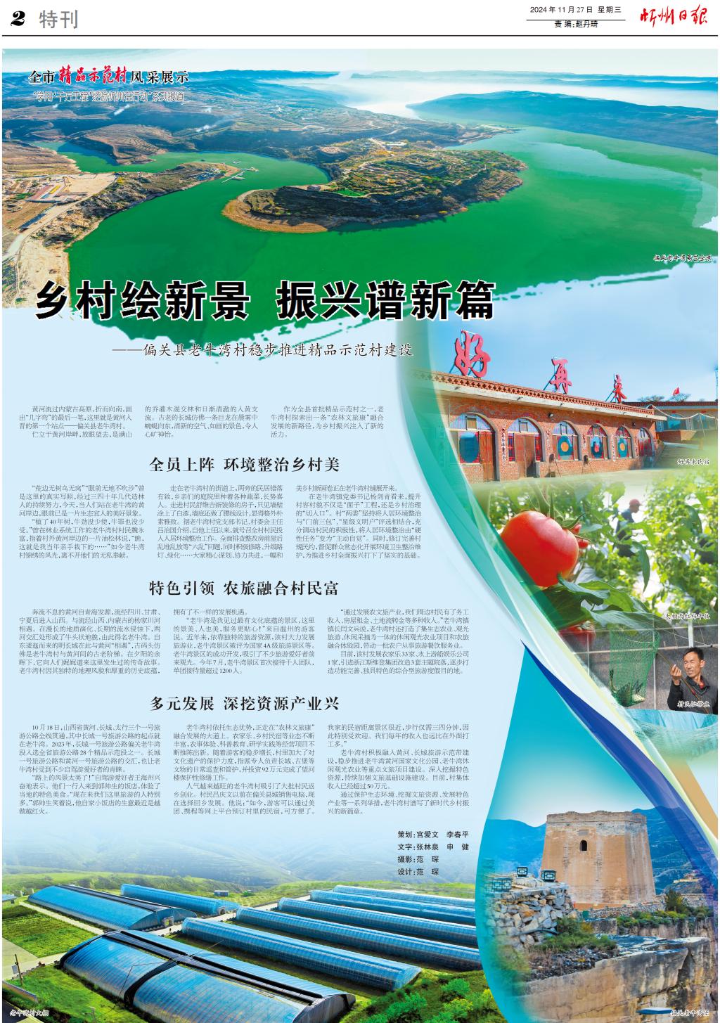 黃河流過(guò)內(nèi)蒙古高原,折而向南,畫(huà)出“幾字彎”的最后一筆,這里就是黃河入晉的第一個(gè)站點(diǎn)——偏關(guān)縣老牛灣村。 佇立于黃河岸畔,放眼望去,是滿山的喬灌木混交林和日漸清澈的入黃支流。古老的長(zhǎng)城仿佛一條巨龍?jiān)诔快F中蜿蜒向東,清新的空氣、如畫(huà)的景色,令人心曠神怡。 作為全縣首批精品示范村之一,老牛灣村探索出一條“農(nóng)林文旅康”融合發(fā)展的新路徑,為鄉(xiāng)村振興注入了新的活力。 全員上陣 環(huán)境整治鄉(xiāng)村美 “荒邊無(wú)樹(shù)鳥(niǎo)無(wú)窩”“眼前無(wú)地不吹沙”曾是這里的真實(shí)寫(xiě)照,經(jīng)過(guò)三四十年幾代造林人的持續(xù)努力,今天,當(dāng)人們站在老牛灣的黃河岸邊,眼前已是一片生態(tài)宜人的美好景象。 “植了40年樹(shù),牛勁沒(méi)少使,牛罪也沒(méi)少受。”曾在林業(yè)系統(tǒng)工作的老牛灣村村民魏永富,指著村外黃河岸邊的一片油松林說(shuō),“瞧,這就是我當(dāng)年親手栽下的……”如今老牛灣村錦繡的風(fēng)光,離不開(kāi)他們的無(wú)私奉獻(xiàn)。 走在老牛灣村的街道上,兩旁的民居錯(cuò)落有致,鄉(xiāng)親們的庭院里種著各種蔬菜,長(zhǎng)勢(shì)喜人。走進(jìn)村民舒維吉新裝修的房子,只見(jiàn)墻壁涂上了白漆,墻底還做了腰線設(shè)計(jì),顯得格外樸素雅致。據(jù)老牛灣村黨支部書(shū)記、村委會(huì)主任呂治國(guó)介紹,自他上任以來(lái),就號(hào)召全村村民投入人居環(huán)境整治工作。全面排查整改房前屋后亂堆亂放等“六亂”問(wèn)題,同時(shí)積極修路、升級(jí)路燈、綠化……大家精心謀劃、協(xié)力共進(jìn),一幅和美鄉(xiāng)村新畫(huà)卷正在老牛灣村鋪展開(kāi)來(lái)。 在老牛灣鎮(zhèn)黨委書(shū)記楊劍青看來(lái),提升村容村貌不僅是“面子”工程,還是鄉(xiāng)村治理的“切入口”。村“兩委”堅(jiān)持將人居環(huán)境整治與“門(mén)前三包”、“星級(jí)文明戶”評(píng)選相結(jié)合,充分調(diào)動(dòng)村民的積極性,將人居環(huán)境整治由“硬性任務(wù)”變?yōu)椤爸鲃?dòng)自覺(jué)”。同時(shí),修訂完善村規(guī)民約,督促群眾常態(tài)化開(kāi)展環(huán)境衛(wèi)生整治維護(hù),為推進(jìn)鄉(xiāng)村全面振興打下了堅(jiān)實(shí)的基礎(chǔ)。 特色引領(lǐng) 農(nóng)旅融合村民富 奔流不息的黃河自青海發(fā)源,流經(jīng)四川、甘肅、寧夏后進(jìn)入山西。與流經(jīng)山西、內(nèi)蒙古的楊家川河相遇。在漫長(zhǎng)的地質(zhì)演化、長(zhǎng)期的流水侵蝕下,兩河交匯處形成了牛頭狀地貌,由此得名老牛灣。自東逶迤而來(lái)的明長(zhǎng)城在此與黃河“相遇”,古碼頭仿佛是老牛灣村與黃河間的古老階梯。在夕陽(yáng)的余暉下,它向人們娓娓道來(lái)這里發(fā)生過(guò)的傳奇故事。老牛灣村因其獨(dú)特的地理風(fēng)貌和厚重的歷史底蘊(yùn),擁有了不一樣的發(fā)展機(jī)遇。 “老牛灣是我見(jiàn)過(guò)最有文化底蘊(yùn)的景區(qū),這里的景美、人也美,服務(wù)更貼心!”來(lái)自溫州的游客說(shuō)。近年來(lái),依靠獨(dú)特的旅游資源,該村大力發(fā)展旅游業(yè),老牛灣景區(qū)被評(píng)為國(guó)家4A級(jí)旅游景區(qū)等。老牛灣景區(qū)的成功開(kāi)發(fā),吸引了不少旅游愛(ài)好者前來(lái)觀光。今年7月,老牛灣景區(qū)首次接待千人團(tuán)隊(duì),單團(tuán)接待量超過(guò)1200人。 “通過(guò)發(fā)展農(nóng)文旅產(chǎn)業(yè),我們周邊村民有了務(wù)工收入、房屋租金、土地流轉(zhuǎn)金等多種收入。”老牛灣鎮(zhèn)鎮(zhèn)長(zhǎng)閆文兵說(shuō),老牛灣村還打造了集生態(tài)農(nóng)業(yè)、觀光旅游、休閑采摘為一體的休閑觀光農(nóng)業(yè)項(xiàng)目和農(nóng)旅融合體驗(yàn)園,帶動(dòng)一批農(nóng)戶從事旅游餐飲服務(wù)業(yè)。 目前,該村發(fā)展農(nóng)家樂(lè)33家、水上游船娛樂(lè)公司1家,引進(jìn)浙江斯維登集團(tuán)改造3套主題院落,逐步打造功能完善、獨(dú)具特色的綜合型旅游度假目的地。 多元發(fā)展 深挖資源產(chǎn)業(yè)興 10月18日,山西省黃河、長(zhǎng)城、太行三個(gè)一號(hào)旅游公路全線貫通,其中長(zhǎng)城一號(hào)旅游公路的起點(diǎn)就在老牛灣。2023年,長(zhǎng)城一號(hào)旅游公路偏關(guān)老牛灣段入選全省旅游公路28個(gè)精品示范段之一。長(zhǎng)城一號(hào)旅游公路和黃河一號(hào)旅游公路的交匯,也讓老牛灣村受到不少自駕游愛(ài)好者的青睞。 “路上的風(fēng)景太美了!”自駕游愛(ài)好者王海州興奮地表示。他們一行人來(lái)到郭帥生的飯店,體驗(yàn)了當(dāng)?shù)氐奶厣朗??!艾F(xiàn)在來(lái)我們這里旅游的人特別多?!惫鶐浬χf(shuō),他自家小飯店的生意最近是越做越紅火。 老牛灣村依托生態(tài)優(yōu)勢(shì),正走在“農(nóng)林文旅康”融合發(fā)展的大道上。農(nóng)家樂(lè)、鄉(xiāng)村民宿等業(yè)態(tài)不斷豐富,農(nóng)事體驗(yàn)、科普教育、研學(xué)實(shí)踐等經(jīng)營(yíng)項(xiàng)目不斷推陳出新。隨著游客的穩(wěn)步增長(zhǎng),村里加大了對(duì)文化遺產(chǎn)的保護(hù)力度,指派專人負(fù)責(zé)長(zhǎng)城、古堡等文物的日常巡查和管護(hù),并投資92萬(wà