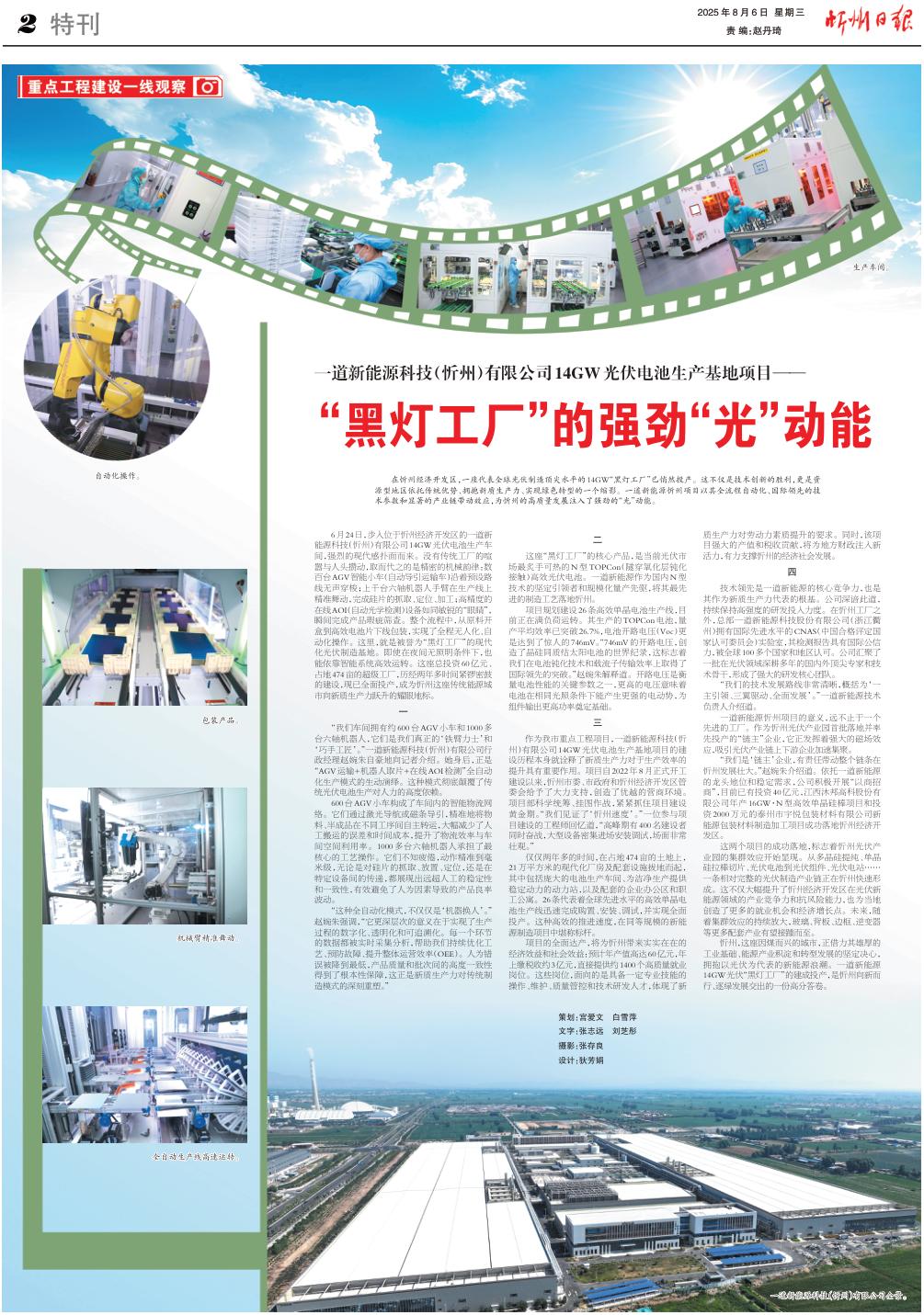 6月24日,步入位于忻州經(jīng)濟開發(fā)區(qū)的一道新能源科技(忻州)有限公司14GW光伏電池生產(chǎn)車間,強烈的現(xiàn)代感撲面而來。沒有傳統(tǒng)工廠的喧囂與人頭攢動,取而代之的是精密的機械韻律:數(shù)百臺AGV智能小車(自動導(dǎo)引運輸車)沿著預(yù)設(shè)路線無聲穿梭;上千臺六軸機器人手臂在生產(chǎn)線上精準舞動,完成硅片的抓取、定位、加工;高精度的在線AOI(自動光學(xué)檢測)設(shè)備如同敏銳的“眼睛”,瞬間完成產(chǎn)品瑕疵篩查。整個流程中,從原料開盒到高效電池片下線包裝,實現(xiàn)了全程無人化、自動化操作。這里,就是被譽為“黑燈工廠”的現(xiàn)代化光伏制造基地。即使在夜間無照明條件下,也能依靠智能系統(tǒng)高效運轉(zhuǎn)。這座總投資60億元、占地474畝的超級工廠,歷經(jīng)兩年多時間緊鑼密鼓的建設(shè),現(xiàn)已全面投產(chǎn),成為忻州這座傳統(tǒng)能源城市向新質(zhì)生產(chǎn)力躍升的耀眼地標。