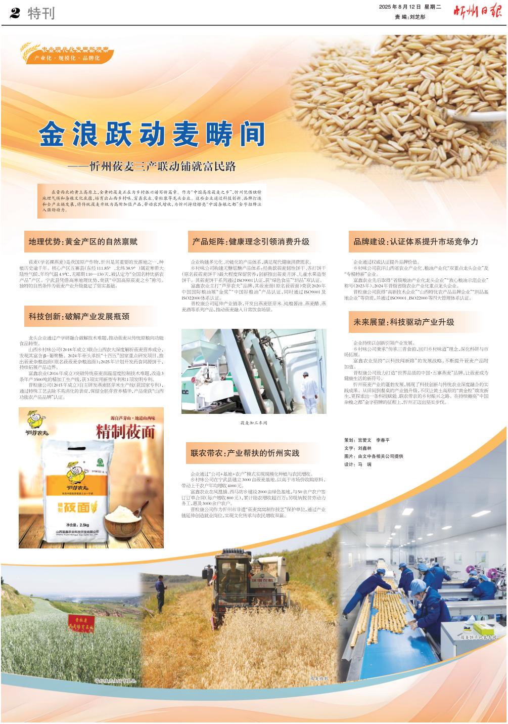 在晉西北的黃土高原上,金黃的莜麥正在為鄉(xiāng)村振興譜寫新篇章。作為“中國高原莜麥之鄉(xiāng)”,忻州憑借獨特地理氣候和雜糧文化底蘊,培育出山西鄉(xiāng)村味、富鑫農(nóng)業(yè)、晉粒康等龍頭企業(yè)。這些企業(yè)通過科技創(chuàng)新、品牌打造和全產(chǎn)業(yè)鏈發(fā)展,將傳統(tǒng)莜麥升級為高附加值產(chǎn)品,帶動農(nóng)民增收,為忻州持續(xù)擦亮“中國雜糧之都”金字招牌注入強勁動力。 地理優(yōu)勢:黃金產(chǎn)區(qū)的自然稟賦 莜麥(學(xué)名裸燕麥)是我國原產(chǎn)作物,忻州是其重要的發(fā)源地之一,種植歷史逾千年。核心產(chǎn)區(qū)五寨縣(東經(jīng)111.85°、北緯38.9°)屬亞寒帶大陸性氣候,年均氣溫4.9℃,無霜期110—130天,被認(rèn)定為“全國名特優(yōu)新農(nóng)產(chǎn)品”產(chǎn)區(qū)。寧武縣憑借高寒地理優(yōu)勢,榮獲“中國高原莜麥之鄉(xiāng)”稱號。獨特的自然條件為莜麥產(chǎn)業(yè)升級奠定了堅實基礎(chǔ)。 科技創(chuàng)新:破解產(chǎn)業(yè)發(fā)展瓶頸 龍頭企業(yè)通過產(chǎn)學(xué)研融合破解技術(shù)難題,推動莜麥從傳統(tǒng)原糧向功能食品轉(zhuǎn)型。 山西鄉(xiāng)村味公司(2018年成立)聯(lián)合山西農(nóng)大深度解析莜麥營養(yǎng)成分,發(fā)現(xiàn)其富含β-葡聚糖。2024年牽頭承擔(dān)“十四五”國家重點研發(fā)項目,推出莜麥雜糧泡面(原名莜莜麥雜糧泡面);2025年計劃開發(fā)藥食同源餅干,持續(xù)拓展產(chǎn)品邊界。 富鑫農(nóng)業(yè)(2016年成立)突破傳統(tǒng)莜麥面溫濕度控制技術(shù)難題,改造3條年產(chǎn)3500噸的精加工生產(chǎn)線,獲3項實用新型專利和1項發(fā)明專利。 晉粒康公司(2015年成立)自主研發(fā)燕麥胚芽米生產(chǎn)線(獲國家專利),通過特殊工藝去除不易消化的表皮,保留全胚芽營養(yǎng)精華,產(chǎn)品榮獲“山西功能農(nóng)產(chǎn)品品牌”認(rèn)證。 產(chǎn)品矩陣:健康理念引領(lǐng)消費升級 企業(yè)構(gòu)建多元化、功能化的產(chǎn)品體系,滿足現(xiàn)代健康消費需求。 鄉(xiāng)村味公司構(gòu)建無糖低糖產(chǎn)品體系:經(jīng)典款莜麥韌性餅干、蘇打餅干(原名莜莜麥餅干)最大程度保留營養(yǎng);創(chuàng)新推出莜麥月餅、兒童水果造型餅干。其莜麥餅干系列通過ISO9001認(rèn)證,獲“綠色食品”“圳品”雙認(rèn)證。 富鑫農(nóng)業(yè)主打“蘆芽農(nóng)夫”品牌,其莜麥面(原名莜莜面)榮獲2020年中國國際糧油展“金獎”“中國好糧油”產(chǎn)品認(rèn)證,同時通過ISO9001及ISO22000體系認(rèn)證。 晉??倒狙由飚a(chǎn)業(yè)鏈條,開發(fā)出燕麥胚芽米、純糧醬油、燕麥醋、燕麥酒等系列產(chǎn)品,推動莜麥融入日常飲食場景。 聯(lián)農(nóng)帶農(nóng):產(chǎn)業(yè)幫扶的忻州實踐 企業(yè)通過“公司+基地+農(nóng)戶”模式實現(xiàn)規(guī)?;N植與農(nóng)民增收。 鄉(xiāng)村味公司在寧武縣建立3000畝莜麥基地,以高于市場價收購原料,帶動上千農(nóng)戶年均增收4000元。 富鑫農(nóng)業(yè)在鳳凰鎮(zhèn)、西馬坊鄉(xiāng)建設(shè)2000畝綠色基地,與50余戶農(nóng)戶簽訂訂單合同(每戶增收800元),累計助農(nóng)增收超百萬;另吸納脫貧勞動力務(wù)工,惠及3000余戶農(nóng)戶。 晉??倒咀鳛樾弥菔蟹沁z“莜麥窩窩制作技藝”保護(hù)單位,通過產(chǎn)業(yè)鏈延伸創(chuàng)造就業(yè)崗位,實現(xiàn)文化傳承與農(nóng)民增收雙贏。 品牌建設(shè):認(rèn)證體系提升市場競爭力 企業(yè)通過權(quán)威認(rèn)證提升品牌價值。 鄉(xiāng)村味公司獲評山西省農(nóng)業(yè)產(chǎn)業(yè)化、糧油產(chǎn)業(yè)化“雙重點龍頭企業(yè)”及“專精特新”企業(yè)。 富鑫農(nóng)業(yè)先后取得“省級糧油產(chǎn)業(yè)化龍頭企業(yè)”“放心糧油示范企業(yè)”稱號(2023年),2024年晉級省級農(nóng)業(yè)產(chǎn)業(yè)化重點龍頭企業(yè)。 晉粒康公司獲得“高新技術(shù)企業(yè)”“山西特優(yōu)農(nóng)產(chǎn)品品牌企業(yè)”“圳品基地企業(yè)”等資質(zhì),并通過ISO9001、ISO22000等四大管理體系認(rèn)證。 未來展望:科技驅(qū)動產(chǎn)業(yè)升級 企業(yè)持續(xù)以創(chuàng)新引領(lǐng)產(chǎn)業(yè)發(fā)展。 鄉(xiāng)村味公司秉承“傳承三晉食韻,回歸鄉(xiāng)村味道”理念,深化科研與市場拓展。 富鑫農(nóng)業(yè)堅持“以科技闖新路”的發(fā)展戰(zhàn)略,不斷提升莜麥產(chǎn)品附加值。 晉粒康公司致力打造“世界品質(zhì)的中國·五寨燕麥”品牌,讓莜麥成為健康生活的新符號。 忻州莜麥產(chǎn)業(yè)的蓬勃發(fā)展,展現(xiàn)了科技創(chuàng)新與傳統(tǒng)農(nóng)業(yè)深度融合的實踐成果。從田間到餐桌的產(chǎn)業(yè)鏈升級,不僅讓黃土高原的“黃金?!睙òl(fā)新生,更探索出一條科技賦能、聯(lián)農(nóng)帶農(nóng)的鄉(xiāng)村振興之路。在持續(xù)擦亮“中國雜糧之都”金字招牌的征程上,忻州正邁出堅實步伐。 策劃:宮愛文 李春平 文字:劉鑫林 圖片:由文中各相關(guān)公司提供 設(shè)計:馬瑞 (責(zé)任編輯:盧相?。?/span> |