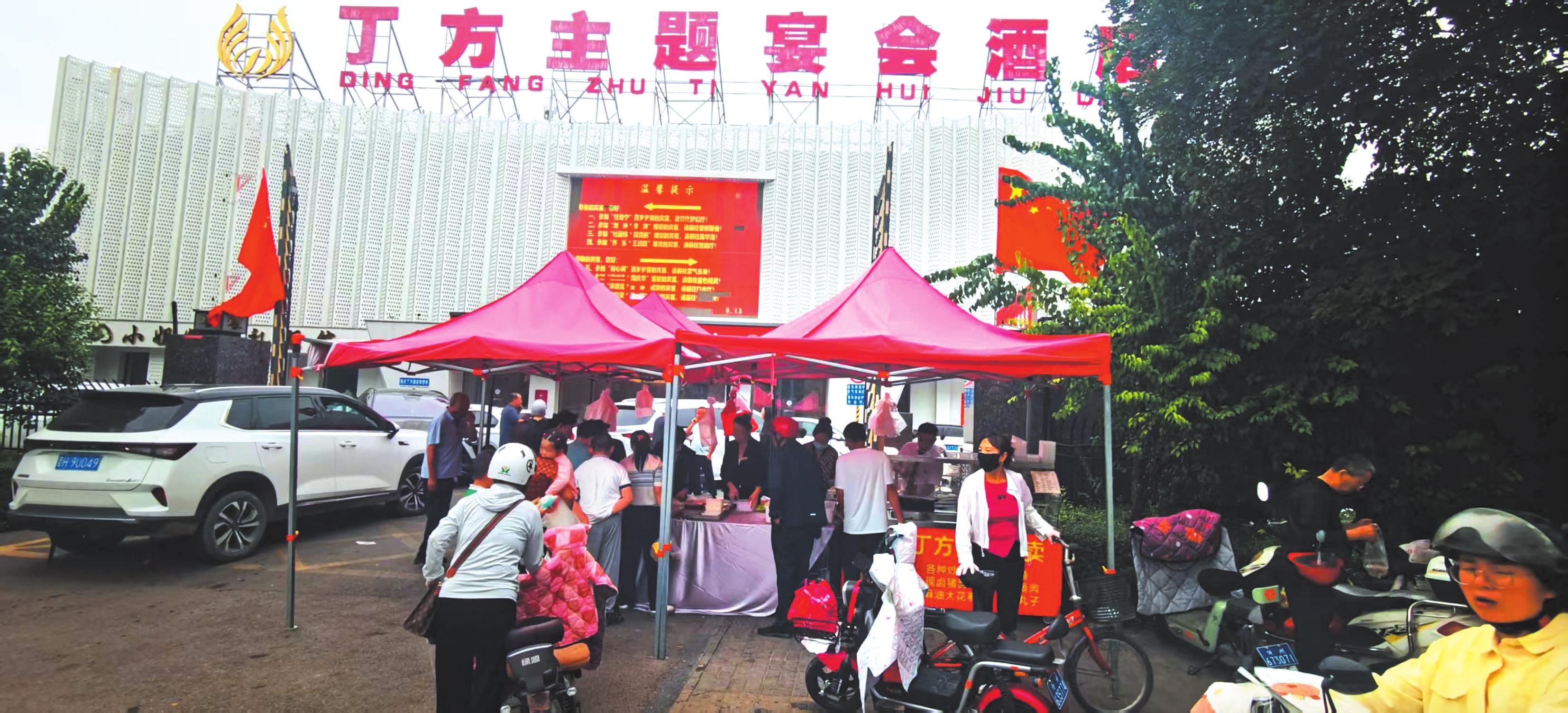 市民在丁方酒店門前的便民攤位排隊(duì)購(gòu)買菜品。