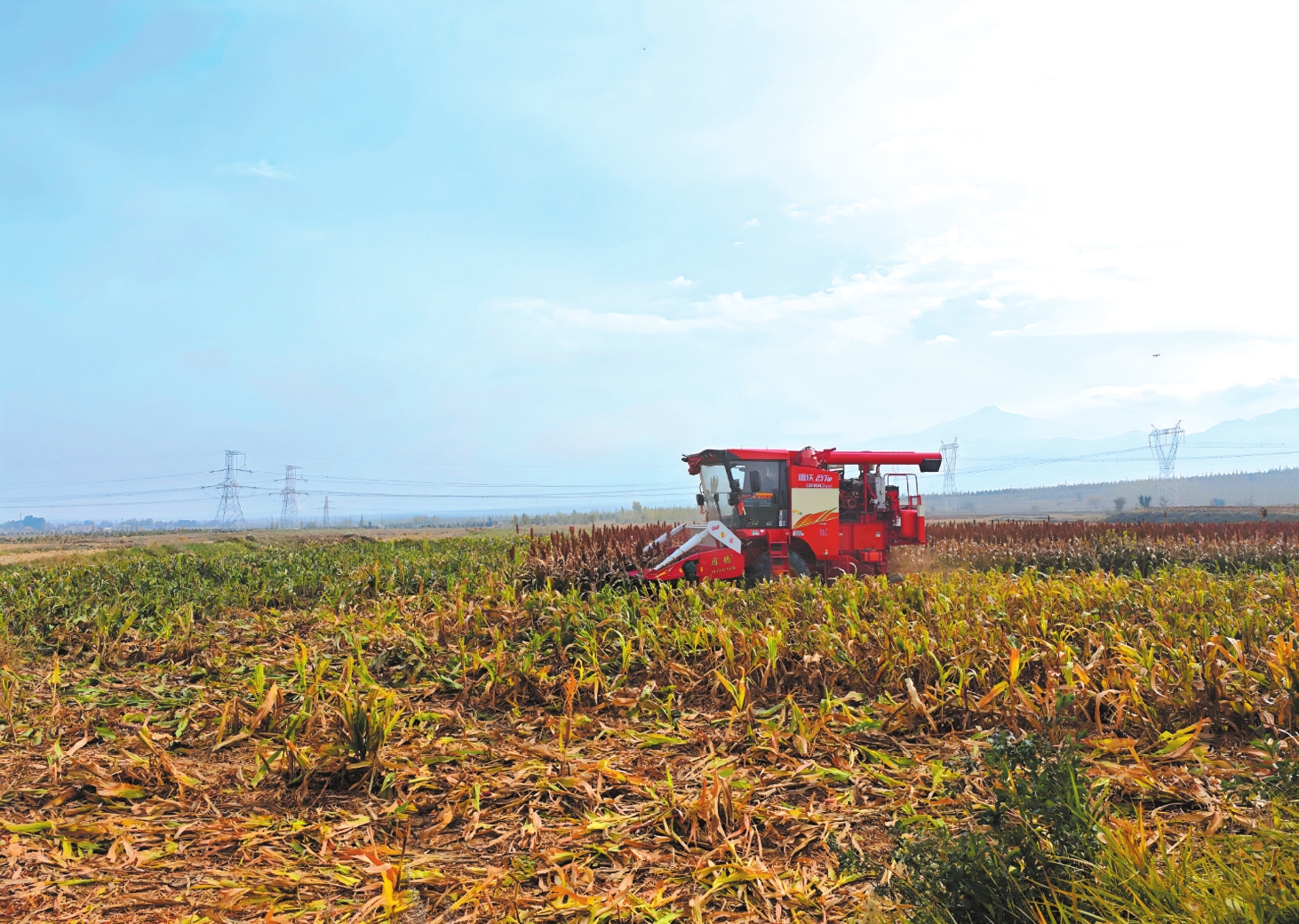 圖為村民正操作農(nóng)機收獲高粱。本報記者 趙丹琦攝