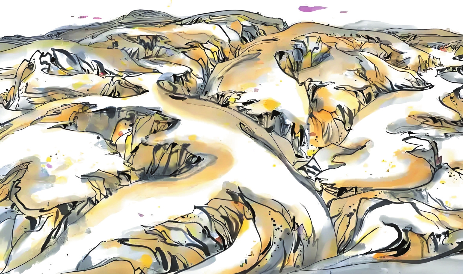 1989年10月的河曲寫生,是吳冠中藝術(shù)生涯的重要轉(zhuǎn)折點(diǎn)。在陪同的學(xué)生王秦生引導(dǎo)下,這位古稀老人尋找“黃土荒漠之典型地區(qū)”,最終駐足晉西北河曲縣。每日晨起,他面對被雨水沖刷、滿山皆溝壑的地貌,靜心思考,猛然產(chǎn)生了驚人的藝術(shù)聯(lián)想——起伏的山形如同眾多老虎,而那些溝壑恰似老虎皮毛上的斑紋。他在《出現(xiàn)老虎》一文中寫道:“我終于發(fā)現(xiàn)黃土高原是展拓了的老虎之群,其間伏臥著無數(shù)猛虎,有的正將躍起,有的還在酣睡。作完數(shù)幅黃土高原,意猶未盡,于是我畫起老虎來。”這種將地理特征轉(zhuǎn)化為藝術(shù)創(chuàng)作標(biāo)志著吳冠中完成“從風(fēng)景寫生到精神寫意”的蛻變,其價值在于為現(xiàn)代中國畫開辟了根植本土、融貫中西的新路徑。一個月河曲翠峰山寫生之旅誕生的《老虎高原》,更以極富樂感的線條勾勒出這片土地精神的圖騰。