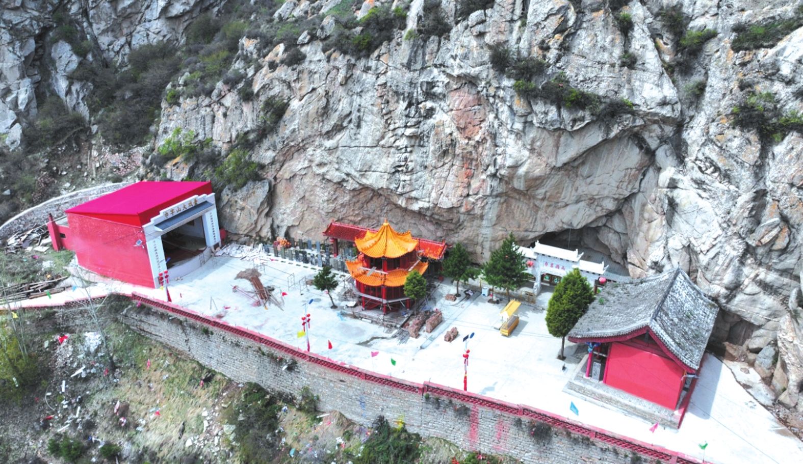 春日里,山桃花與山杏花沿坡綻放,粉白相間的花海從山腳漫至山腰,與翠綠的松柏相映成趣。此時若恰逢細雨,云霧在花間游走,“巾巖瀨雨”的奇景尤為靈動,水滴擊石的清音與花開的簌簌聲交織,仿佛天地間的私語。盛夏時節(jié),山中松濤陣陣,涼意襲人。雙巾峰下的“沁心泉”水量充沛,泉水清冽甘醇,飲之可去暑熱。沿山路行至“回音壁”,一聲呼喊能引來七聲回應,故又稱“七響巖”。傍晚時分,夕陽為石灰?guī)r峰巒鍍上金邊,池面波光粼粼,形成“巾峰夕照”的景致,與“瀨雨”并稱山中雙絕。秋日登高,則見株株松樹挺拔直立,廟宇與油松交相輝映,層林盡染。此時“瀨雨”之景尤為別致,洞內(nèi)泉水如鐘表滴答,當?shù)厝朔Q為“秋漏”。有現(xiàn)代詩人描繪此景:“巾巖雄峙,霧繞云纏多靈氣;瀨雨淋漓,珠垂墜玉一奇觀?!毙蜗蟮匕炎匀恢襞c時間之感巧妙融合。冬雪初霽時,巾字山銀裝素裹,雙巾峰如白玉雕琢的冠冕,“瀨雨”洞洞外凝結(jié)的冰棱如水晶簾幕,陽光折射下七彩斑斕,構(gòu)成冬日里的清麗樂章。