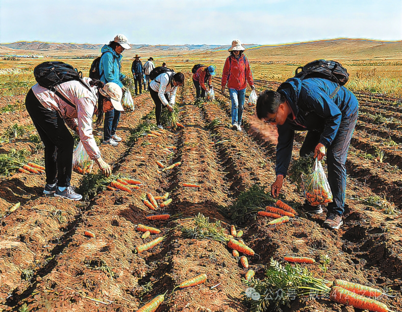 “撿秋”游演繹著“鄉(xiāng)土中國(guó)”的現(xiàn)代篇章。費(fèi)孝通在《鄉(xiāng)土中國(guó)》開篇即言“從基層上看去,中國(guó)社會(huì)是鄉(xiāng)土性的”。這種“鄉(xiāng)土性”的核心是人與土地的深度綁定。農(nóng)民靠土地生存,土地是文化認(rèn)同的根基?!皳烨铩边@種農(nóng)耕活動(dòng),如今以更加鮮活方式延續(xù)下來。對(duì)農(nóng)民而言,土地不僅是謀生手段,更是安身立命的“精神原鄉(xiāng)”。而城市游客的參與則賦予了“撿秋”新的意義。在城市里待久了,就想蹲在田里感受泥土的溫度,游客“撿秋”體驗(yàn)的是“春種秋收”踏實(shí)感。這種體驗(yàn)式參與是現(xiàn)代人對(duì)鄉(xiāng)土文明的“情感反哺”。游客們彎腰的身影既是對(duì)土地的致敬,也是對(duì)“根”的追尋。他們未必真懂農(nóng)事,但通過參與“撿秋”完成了對(duì)鄉(xiāng)土文化的認(rèn)同,被撿起的“果實(shí)”從“生存作物”演變?yōu)椤拔幕浇椤?。?dāng)前,內(nèi)蒙古各地推出的挖土豆、烤土豆等旅游項(xiàng)目是對(duì)鄉(xiāng)土資源的文化再“編碼”,當(dāng)土豆從田間走向游客的后備箱,“鄉(xiāng)土中國(guó)”便獲得了更加豐富的表達(dá)。