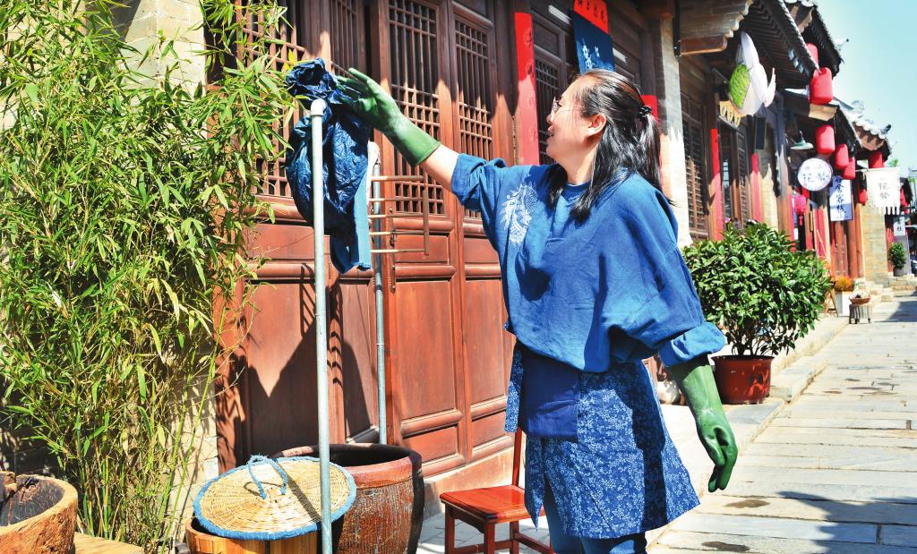 趙慧的藍(lán)染缸是金貴的,但她并不藏私,只要有人愿意學(xué),她總是歡喜接納。來(lái)到古城之后,她開展了很多次藍(lán)染體驗(yàn)活動(dòng),大人和孩子們戴上手套,穿好工作服,來(lái)到染缸前,把自己親手扎好或畫好的白布放進(jìn)去,起先出來(lái)是綠色,然后是淺藍(lán)、深藍(lán),最后得到一塊有白色花紋和圖案的藍(lán)染作品。趙慧愿意把藍(lán)染的樂趣和神奇與更多的人分享,因?yàn)樗?,只有讓更多的人了解和知道,天然染這項(xiàng)古老的技藝才能傳承下去,而不會(huì)丟失在時(shí)光里。