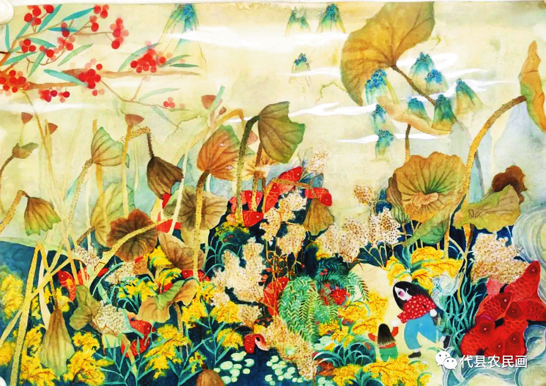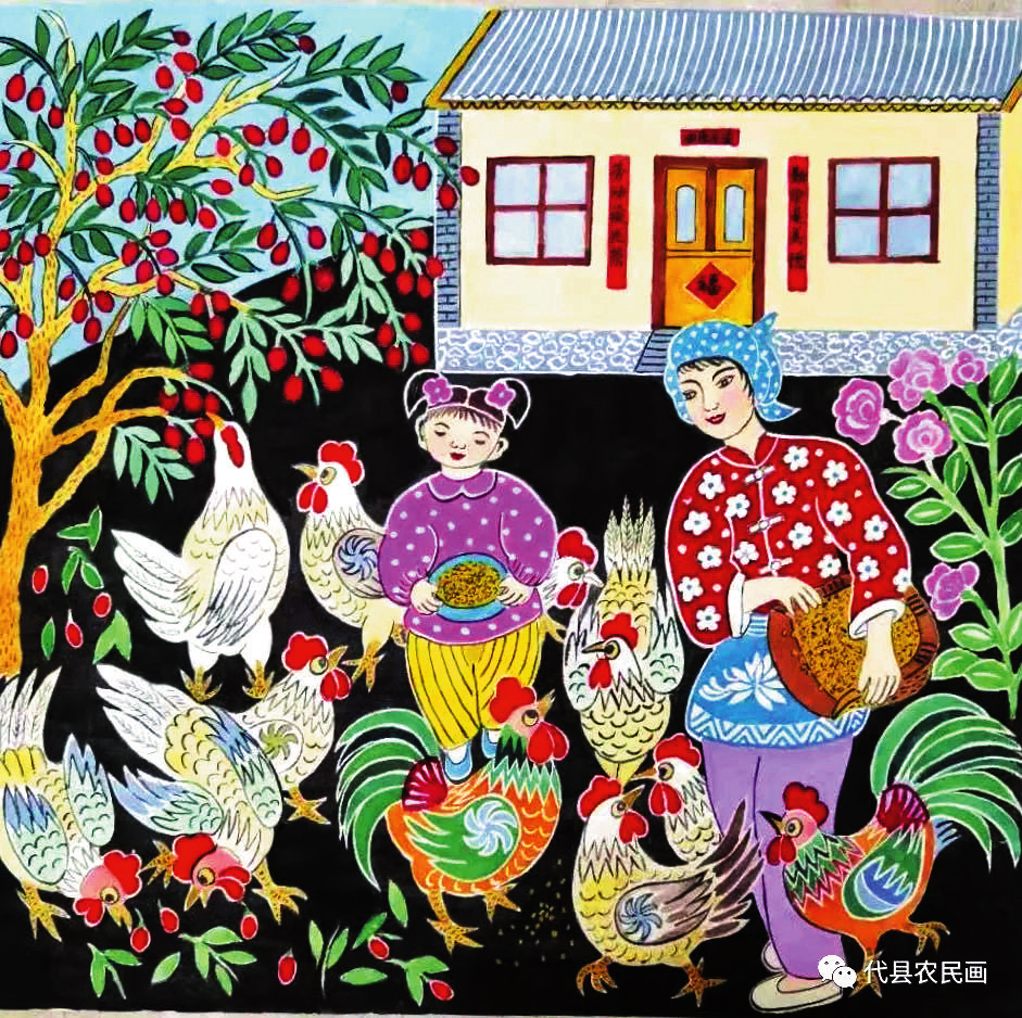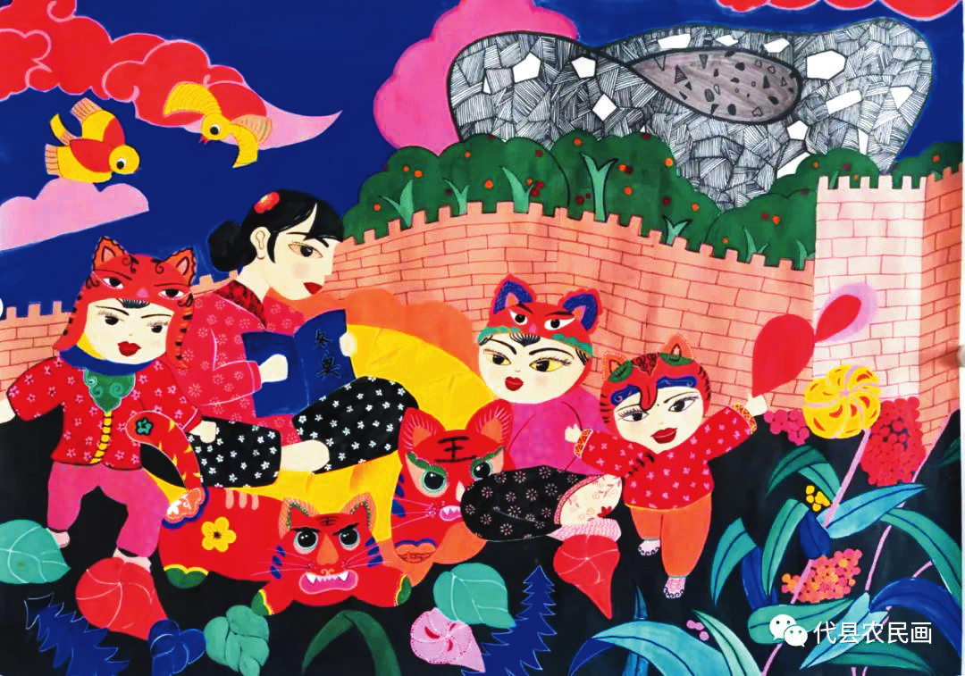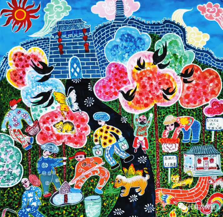 中國(guó)歷史文化名城代縣,文化底蘊(yùn)深厚,民俗傳統(tǒng)技藝精巧別致,1988年和2008年先后被文化部授予“中國(guó)民間繪畫畫鄉(xiāng)”“中國(guó)民間文化藝術(shù)之鄉(xiāng)”。該縣的農(nóng)民畫早在上世紀(jì)80年代初就在全國(guó)產(chǎn)生過較大影響,之后經(jīng)歷了一段低迷期。近年來在代縣農(nóng)民畫促進(jìn)會(huì)的推動(dòng)之下,農(nóng)民畫又重新煥發(fā)出耀眼的光彩。先后涌現(xiàn)出多位畫家,其中尤以丁全愛、戴翠平、祁磊、賈永花、郎冬梅等18位女畫家組陣的雁門巾幗,在多年鉆研繪畫技巧的基礎(chǔ)上,創(chuàng)作出一幅幅特色鮮明、獨(dú)具匠心的畫作,成為閃耀三晉大地的矩陣,為傳承、弘揚(yáng)雁門文化做出了新貢獻(xiàn)。