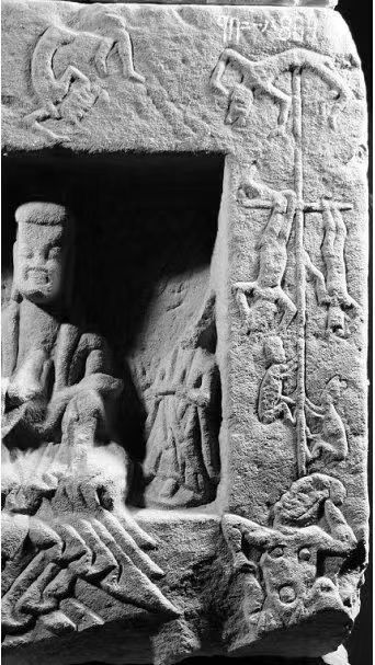 請看下圖。這幅圖是云岡第38窟中的一幅石刻墨線描摹圖,它應該叫《橦倒樂伎圖》。圖中的表演與峨口撓閣非常相似,比今天的峨口撓閣更驚險、更具觀賞性。如果我們把這幅圖和峨口撓閣比較一下,會清楚地發(fā)現(xiàn),峨口撓閣藝術歷史久遠、文化根脈綿長,會發(fā)現(xiàn)峨口撓閣曾經的歷史高度和文化沃土的厚度。