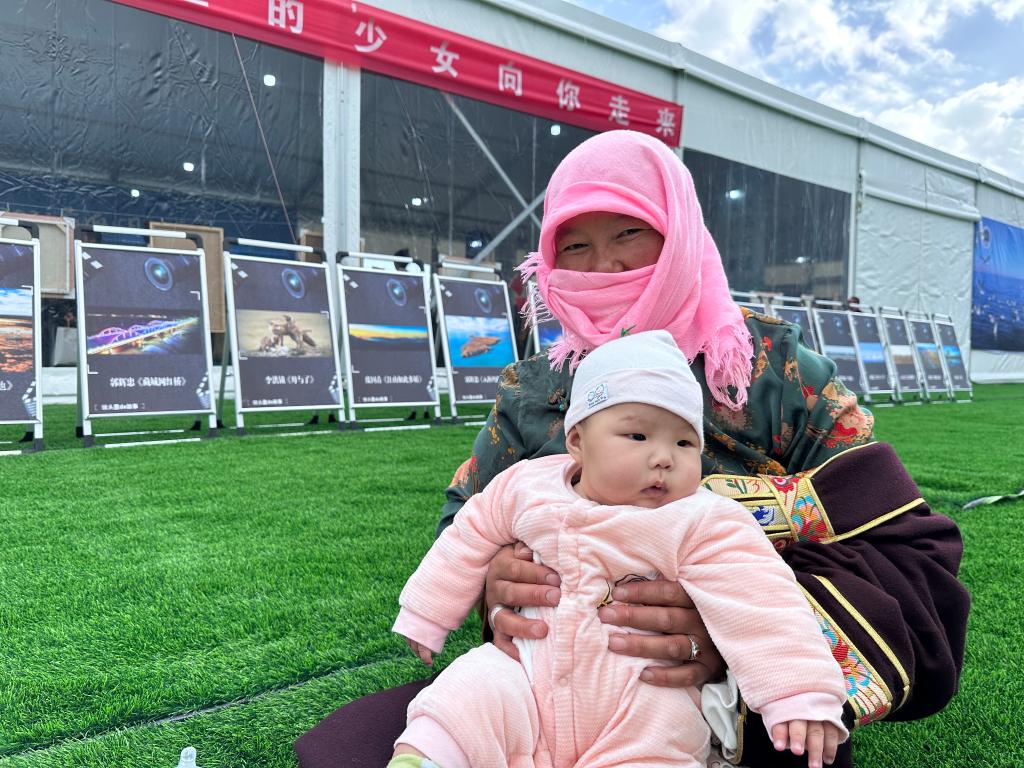 6月28日,青海省海北藏族自治州剛察縣伊克烏蘭鄉(xiāng)剛察貢麻村村民德格措和孫女在詩歌節(jié)現(xiàn)場。新華社記者 白瑪央措 攝
