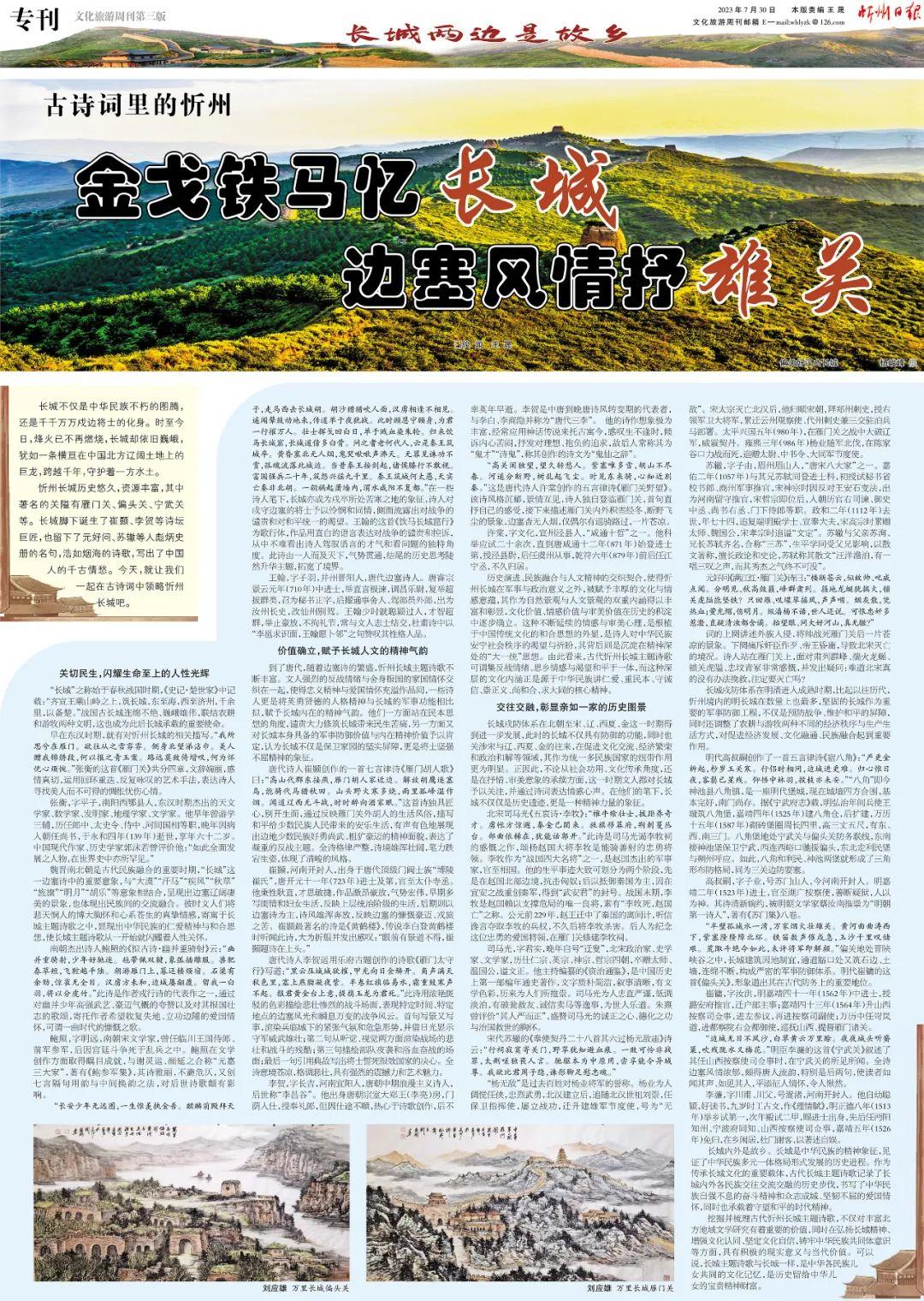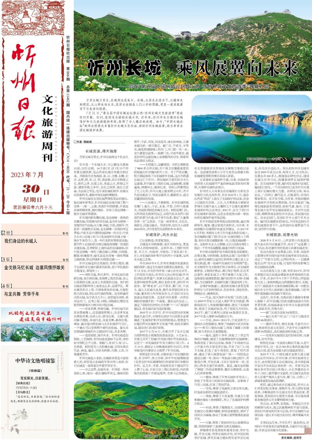 忻州日?qǐng)?bào)《文化旅游周刊》 以“長(zhǎng)城兩邊是故鄉(xiāng)”為主題 特別推出一期“忻州長(zhǎng)城???/p> 四個(gè)版面各有側(cè)重 交響合奏 解讀關(guān)鍵詞 長(zhǎng)城資源 長(zhǎng)城保護(hù) 長(zhǎng)城旅游 緊扣關(guān)鍵事 長(zhǎng)城人物 長(zhǎng)城詩(shī)詞 長(zhǎng)城攝影 講述忻州長(zhǎng)城故事 豐富忻州長(zhǎng)城文化內(nèi)涵 助力共享全國(guó)長(zhǎng)城保護(hù)成果 01