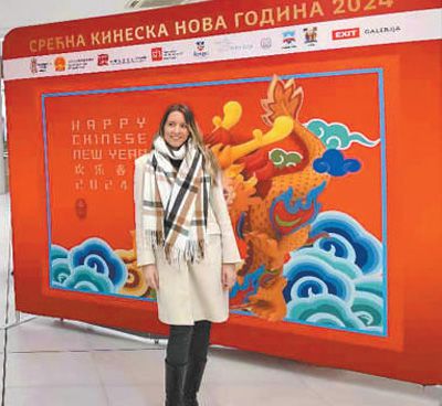 1月30日,在塞爾維亞諾維薩德,一位女士在“歡樂(lè)春節(jié)”活動(dòng)展板前留影。本報(bào)記者 謝亞宏攝