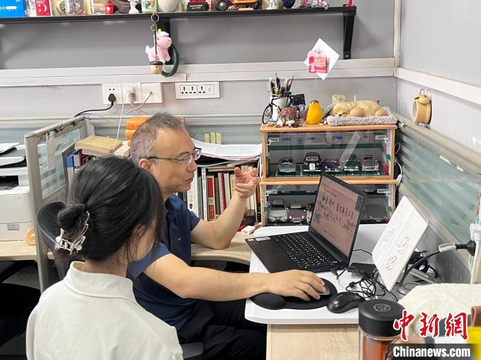5月8日,江漢大學(xué)設(shè)計(jì)學(xué)院教授魏坤正在指導(dǎo)學(xué)生創(chuàng)作標(biāo)識(shí)。武一力攝
