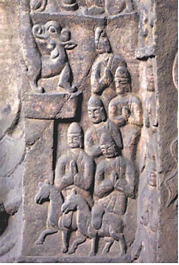 在第16—1窟佛龕左側的商隊畫面中,五名商人頭戴尖頂帽,身穿窄袖長袍,腰部系帶,雙手合十,縱向排列,似錯落跪于佛龕一側。這些商人樣貌各異,上方第二名商人深目高鼻,面頰清瘦,蓄長髯,目光看向前方。其余四名商人或目光低垂,或望向前方。畫面下方雕刻兩匹向前行進的馬匹,背馱貨物,右足抬起,動態(tài)十足。這些商人與傳統(tǒng)中原人的樣貌、穿著明顯不同,應是《北史·西域傳》中所記“深目、高鼻、多髯,善商賈”的西域商人。這樣的場面,在云岡第12、17窟中也有發(fā)現(xiàn)。