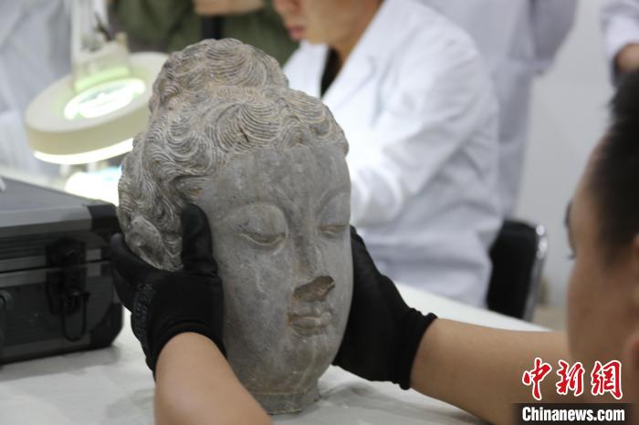 5月20日,河南洛陽(yáng),龍門(mén)石窟研究院工作人員展示已完成修復(fù)的唐代佛頭。 中新社記者 闞力 攝