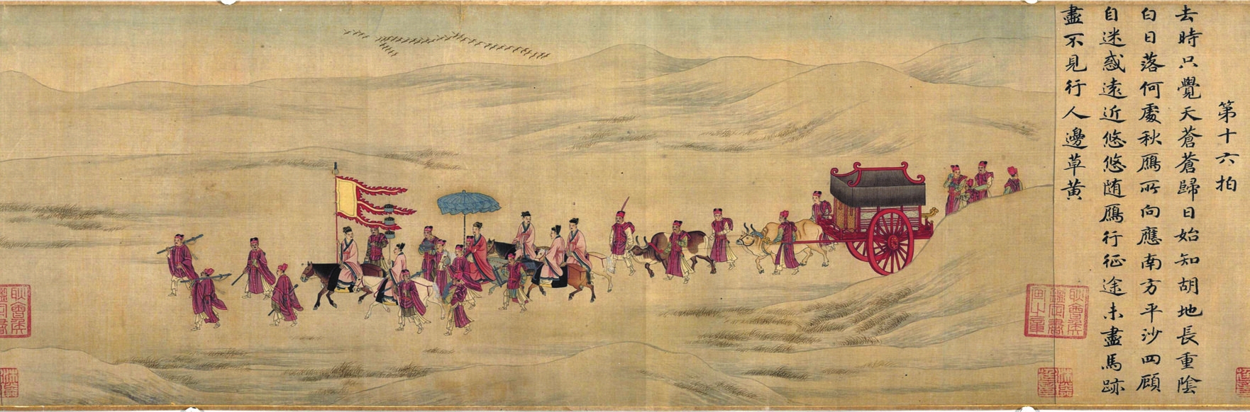 通過出土和存世的一些圖像,我們可以一窺漢代旄節(jié)之真容。洛陽燒溝61號(hào)西漢壁畫墓中的壁畫磚上繪有一持節(jié)使者;山東嘉祥武氏祠一組畫像中,描繪了漢使持節(jié)拜見王陵之母的場景,手中所持之節(jié)正是旄三重,只是看起來柄長不到八尺。至于“旄節(jié)之制”,漢代與先秦當(dāng)是有別的,將旄牛尾編成三重流蘇的制節(jié)之法始于漢,《事物紀(jì)原》載:“漢人有持節(jié),乃古旄也。然則節(jié)自周始,而旄節(jié)則起于漢也?!边@種持節(jié)使的形象,在南宋人所繪《胡笳十八拍》和《迎鑾圖》等表現(xiàn)外交題材的畫作中,仍有清晰體現(xiàn),可見這種持節(jié)出使的制度在古代一直延續(xù)。