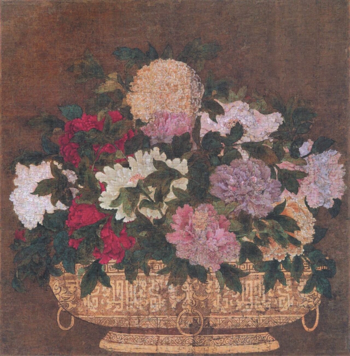 日本知恩院藏有一幅宋代《牡丹圖》,畫上共12朵盛放的牡丹,尺寸超大,花色各異。盛花器皿是一只類似簋的金色青銅器,器形圓滿端莊,紋飾線條飽滿,連拉環(huán)都被畫成滿圓,材質(zhì)似為青銅,也可能是金。花朵插放與花器呈“品”字偏圓形布局。細密的絹絲雖已襤褸,但其靜穆而雍容華貴的氣質(zhì)仍令人震撼——它是傳世牡丹圖中最令人印象深刻的一幅。