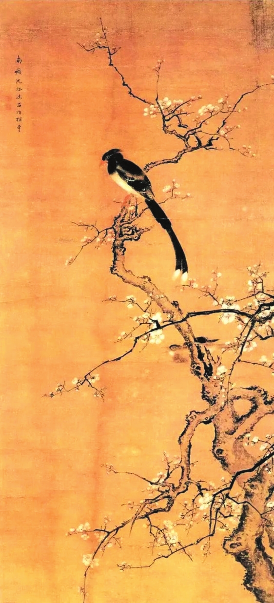 宋代畫家筆下的梅花大都與禽鳥有所關(guān)聯(lián),這主要得益于花鳥畫在此時的繁盛之勢。宋徽宗趙佶的《臘梅山禽圖》就把梅花與白頭翁聯(lián)系起來,描繪了在乍暖還寒的季節(jié)里,兩只相伴而生的白頭翁立于臘梅枝頭的場景,給觀者帶來復(fù)蘇之感。作品左下角題詩“山禽矜逸態(tài),梅粉弄輕柔。已有丹青約,千秋指白頭”,表達了愛情之思。因為白頭翁在傳統(tǒng)文化中象征吉祥與幸福,是對白頭偕老的隱喻,當(dāng)它與梅花結(jié)合起來時,便會強化人們對美好愛情的聯(lián)想。