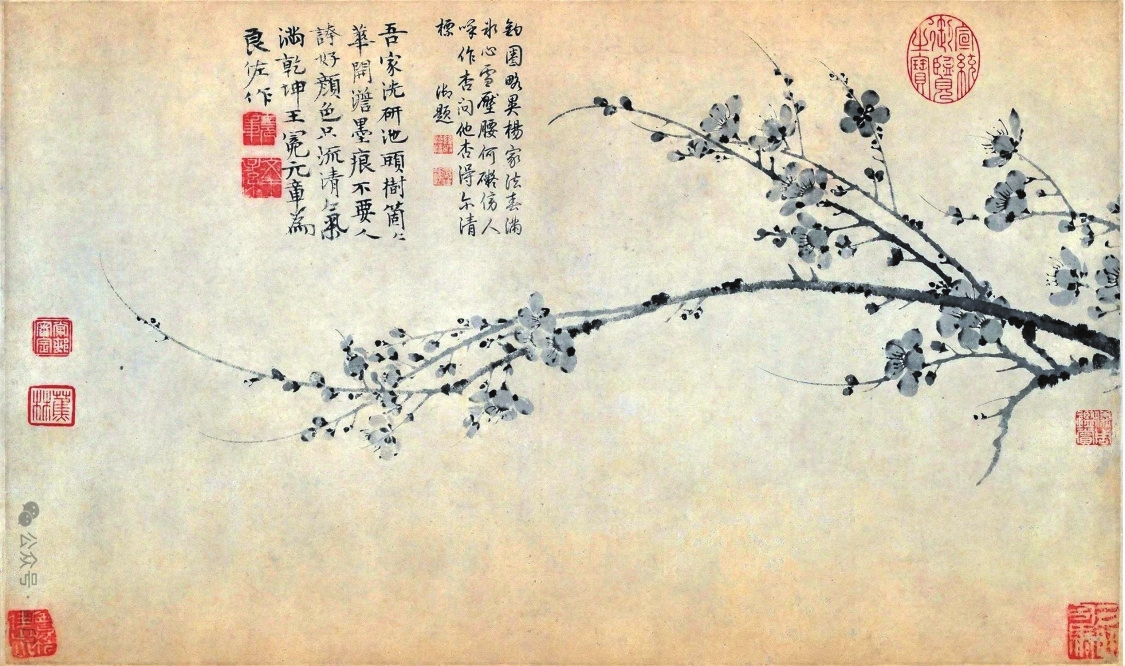 以梅入畫,最早出現(xiàn)于南北朝時期,不過并未成氣候,直到宋代,以梅花入題的中國畫才顯露實績。人們所熟知的“梅妻鶴子”典故與北宋隱士林逋有關(guān),雖以愛梅著稱,但他并無梅花繪畫作品傳世。被稱為“墨梅始祖”的僧人仲仁亦活躍于宋代,他以水墨深淺描摹梅花,全然摒棄色彩,后世稱之為“墨梅”。