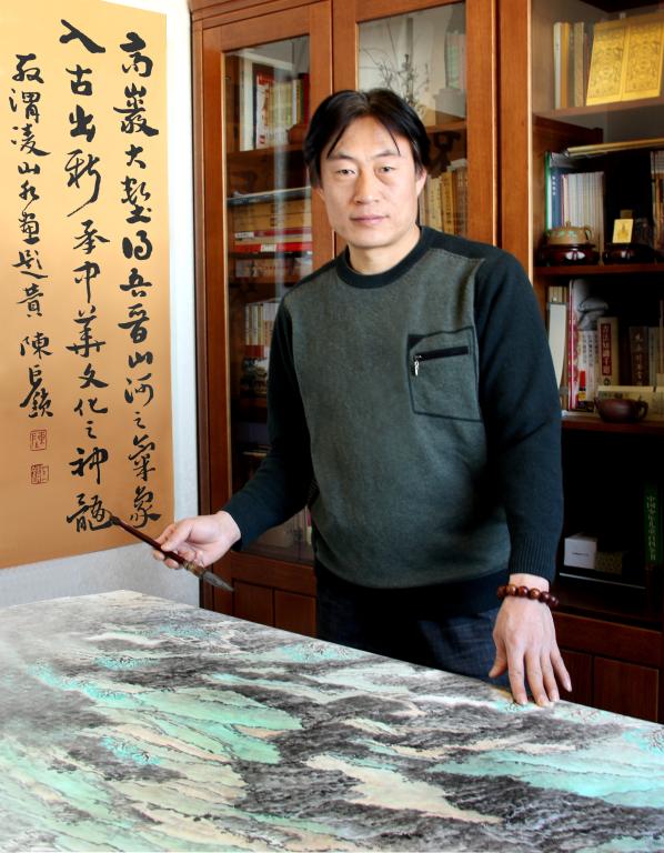 認(rèn)識殷渭凌,是先認(rèn)識他的畫,前幾年在一次省里畫展上看到了一幅山水畫,淳樸、厚重,樸實(shí)的親切、厚重的實(shí)在,完全沒有近幾年流行的風(fēng)氣,也沒有長期臨摹傳統(tǒng)繪畫形成的習(xí)氣。正如一個從鄉(xiāng)村走出來的小伙,健康、有朝氣、單純、樸實(shí)、憨厚、怯生生的站在那里,給我留下了很深的印象。因?yàn)樾弥莸貐^(qū)畫山水的人不多,很快就認(rèn)識了渭凌。果然人如其畫,淳樸、厚道、話不多、為人真誠,是個畫畫肯下功夫的小伙子。后來省美協(xié)山水畫藝委會的活動都有他的身影,畫越畫越多,畫的也越來越好,但是畫面中那種親切、樸實(shí)、厚重、蒼茫的特點(diǎn)卻一點(diǎn)兒也沒有丟失。濃濃的泥土氣息生發(fā)于筆墨中,散發(fā)在畫面里,在展廳里感染著每一個觀眾。晉西北風(fēng)情在他的營造下得到了充分的體現(xiàn)。