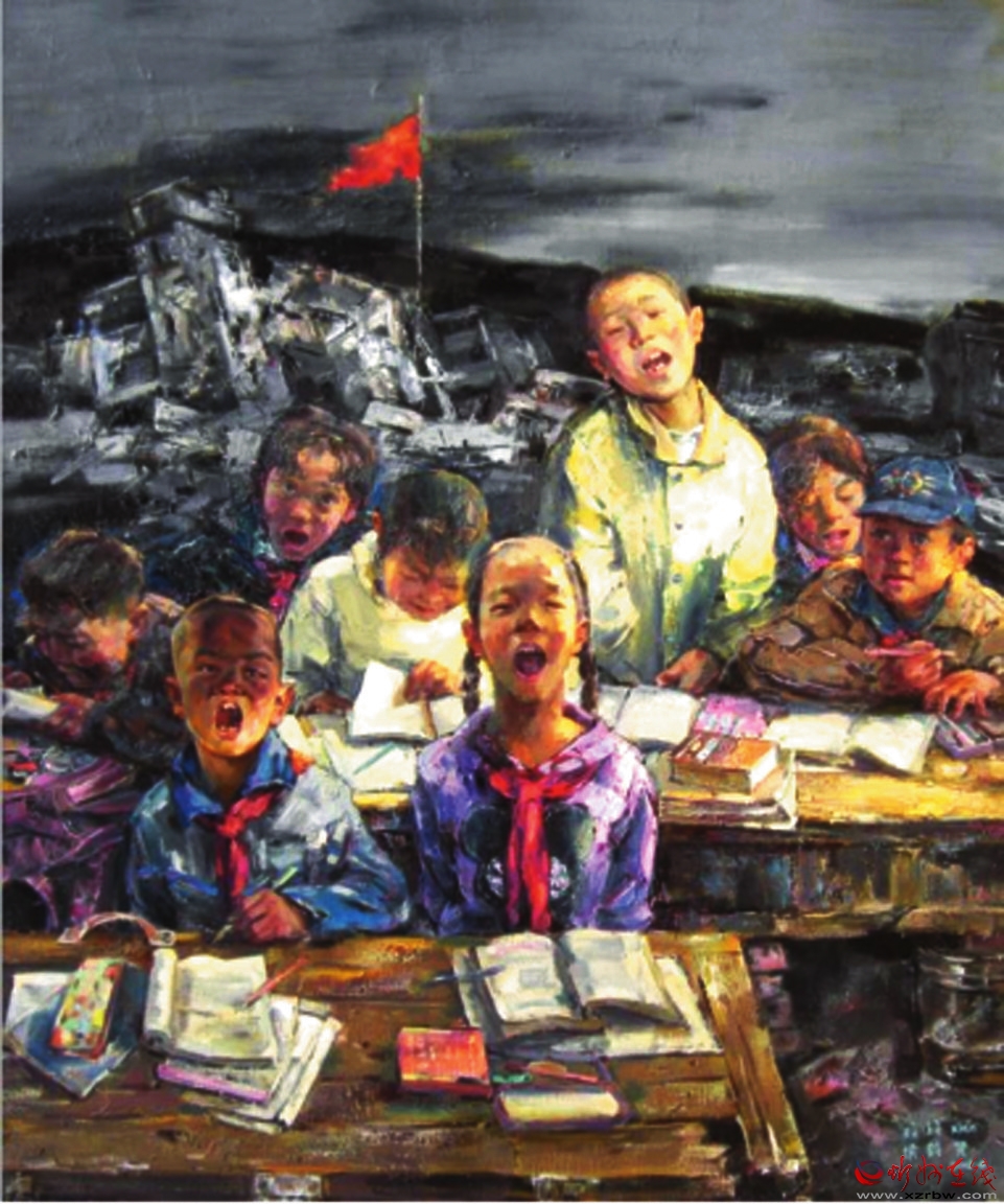 同樣表現(xiàn)地震題材的另一幅作品《震后復課》則展示出另外一種浪漫情懷,發(fā)人深省,令人感慨萬千。在尚未處理完畢的地震廢墟上,孩子們真誠地開始了希望的追求,展示著大震壓不垮的人性力量和災后最具震撼力的希望。是的,紅旗在哪里,精神支撐就在哪里。孩子是希望,是未來。在孩子們的臉上,沒有恐懼和悲哀,沒有茫然與無助,有的只是對知識的渴望,對未來的憧憬。一個角落的復課場景,映射著中華民族偉大復興的精神力量。 邢晨聲 文