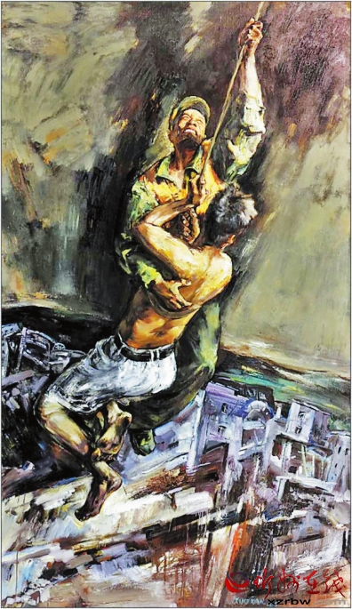 作品《空中救援》中,觀者首先感受到的就是難度。主題表現(xiàn)的事件難度和畫面表現(xiàn)處理的難度交織在一起,讓我們在驚險、焦急的心理壓力下感受到生命的脆弱??罩芯仍闪松奈ㄒ煌ǖ馈>仍瑯邮请U象環(huán)生、驚心動魄。從畫面處理技巧上是一種挑戰(zhàn),天空與地面的透視關系,動感與靜態(tài)的對立統(tǒng)一,那種命懸一線的緊迫感對心理的沖擊力,通過大刀闊斧的刮刀、筆觸處理,和蒼涼緊迫的色調(diào)關系,準確地展示了主題思想,大膽省略了一些不必要的細節(jié)描寫。用大筆觸、大色塊表現(xiàn)背景的壓抑和險峻,救援主體成為沖破這一重壓的希望之色。沒有去刻意刻畫天與地的真實場景,簡潔概括但不呆板空洞,這種果斷的駕馭,是續(xù)鶴賢真實實力的體現(xiàn)。 邢晨聲 文