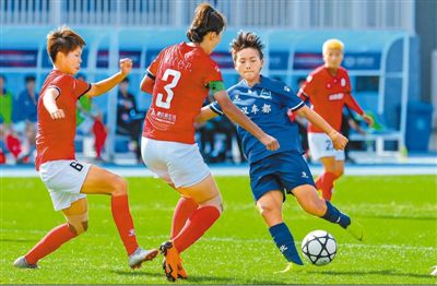 8月23日,武漢車都江大隊(duì)球員王霜(左三)在比賽中射門。新華社記者 江文耀攝