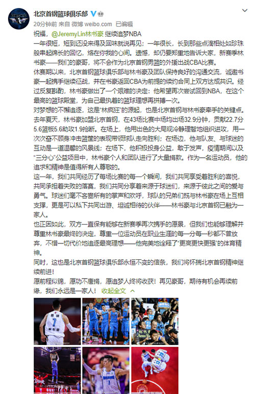 林書豪個人社交平臺視頻截圖 人民網(wǎng)北京9月15日電(楊喬棟)15日,林書豪通過個人社交平臺發(fā)布自制視頻宣布,下個賽季將不再代表北京首鋼男籃征戰(zhàn)CBA賽場,而將繼續(xù)尋求征戰(zhàn)美國職業(yè)籃球聯(lián)賽的機會。林書豪在視頻中稱,最近四周都在思考下一步的規(guī)劃,但是最終還是忍痛做了一個艱難的決定——暫時告別CBA,“我決定今年(下個賽季)不回首鋼去打球,這個決定是我人生最難的一個決定?!彪S后,北京首鋼男籃通過官方微博發(fā)布長文,在確認林書豪“離開”的同時也第一時間為其送上祝福。北京男籃官宣全文如下: 一年很短,短到還沒來得及回味就說再見;一年很長,長到那些點滴相處如珍珠般串起綿長的回憶,烙在你我的心間。遺憾,卻仍要鄭重地告訴大家,新賽季林書豪——我們的豪哥,將不會作為北京首鋼男籃的外援出戰(zhàn)CBA比賽。 休賽期以來,北京首鋼籃球俱樂部與林書豪及團隊保持良好的溝通交流,誠邀書豪一起攜手繼續(xù)征戰(zhàn),并在書豪返回CBA為前提的續(xù)約合同上雙方達成共識。經(jīng)過反復(fù)斟酌,林書豪做出了一個艱難的決定:他希望再次嘗試回到NBA,在這個最高的籃球殿堂,為自己最執(zhí)著的籃球理想再拼搏一次。 對夢想的不懈追逐,這是“林瘋狂”的源起,也是北京首鋼與林書豪牽手的關(guān)鍵點。去年夏天,林書豪加盟北京首鋼,在43場比賽中場均出場32.9分鐘,貢獻22.7分5.6籃板5.6助攻1.9搶斷。在場上,他用出色的大局觀冷靜理智地組織進攻,用一次次奮不顧身沖擊籃筐的表現(xiàn)帶領(lǐng)球隊走向勝利;在場邊,他與隊友、與球迷的互動是一道溫馨的風(fēng)景線;在場下,他積極投身公益,敢于發(fā)聲,疫情期間以及“三分心”公益項目中,林書豪個人和團隊進行了大量捐款。作為一名運動員,他的追求和精神是值得所有人尊敬的。 這一年,我們共同經(jīng)歷了每場比賽的每一個瞬間,我們共同享受著勝利的喜悅,共同承擔(dān)著失敗的落寞,我們共同分享著來源于球迷們,來源于彼此之間的愛與勇氣。球迷們毫不吝嗇所有的掌聲和歡呼,球隊的兄弟們既與林書豪在場上互相支撐,更是可以私下共同出游、坦誠相待的伙伴——林書豪與北京首鋼已融為一家人。 也正因如此,雙方一直保有能夠在新賽季再次攜手的愿景,但我們也能夠理解并尊重林書豪最終的決定,尊重一位運動員在職業(yè)生涯的每一分每一秒都不曾放棄,不惜一切代價地追逐最高理想——他完美地詮釋了“更高更快更強”的體育精神。 同時,這也是北京首鋼籃球俱樂部永恒不變的信條,我們將懷揣北京首鋼精神繼續(xù)前進! 愿前程似錦,愿功不唐捐,愿追夢人終將收獲!再見豪哥,期待有機會再續(xù)前緣,我們永遠是一家人!
