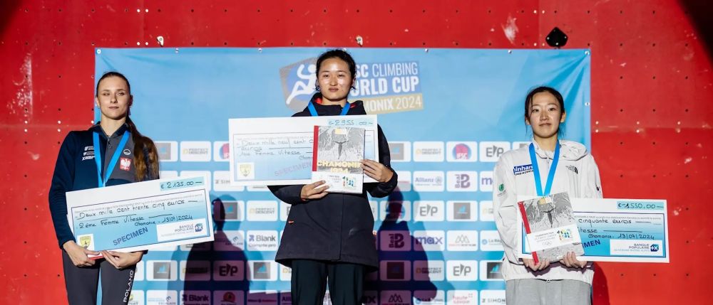 中國選手張少琴(中)在2024攀巖世界杯法國夏蒙尼站中獲得女子速度項目冠軍。圖源:國際攀聯(lián)官網(wǎng)