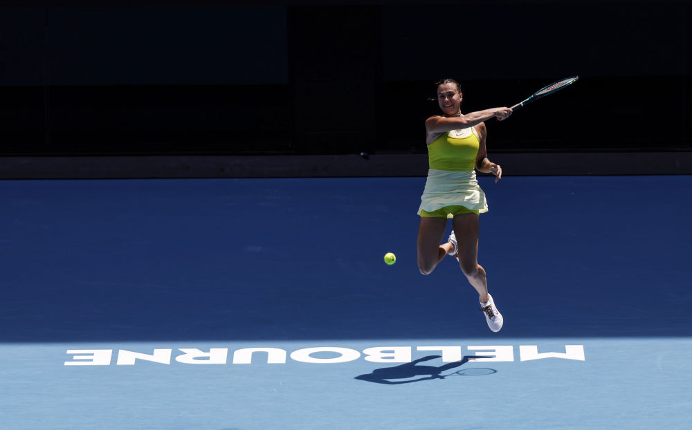1月19日,薩巴倫卡在比賽中回球。新華社記者 馬平 攝