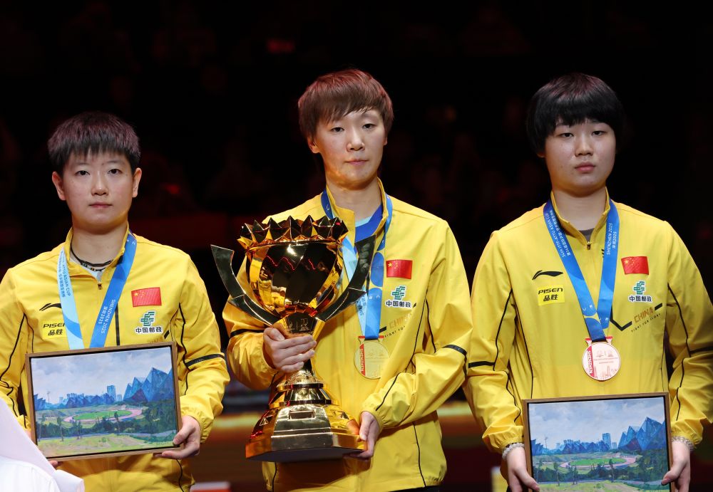 2月23日,冠軍王曼昱(中)、亞軍孫穎莎(左)和季軍蒯曼在頒獎儀式上合影。當(dāng)日,在廣東深圳舉行的第34屆國際乒聯(lián)-亞乒聯(lián)盟亞洲杯女子單打決賽中,中國選手王曼昱4比0戰(zhàn)勝隊友孫穎莎,奪得冠軍。新華社記者 盧漢欣 攝