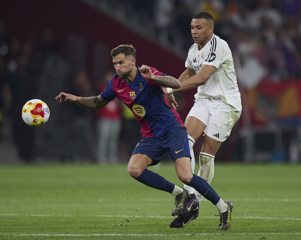 4月26日,巴塞羅那隊球員伊尼戈·馬丁內(nèi)斯(左)和皇家馬德里隊球員姆巴佩在比賽中拼搶。新華社發(fā)(帕布羅·莫拉諾 攝)