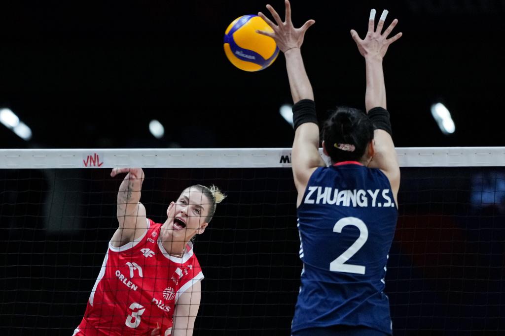 6月5日,波蘭隊球員斯蒂夏克(左)在比賽中扣球。新華社記者 鞠煥宗 攝