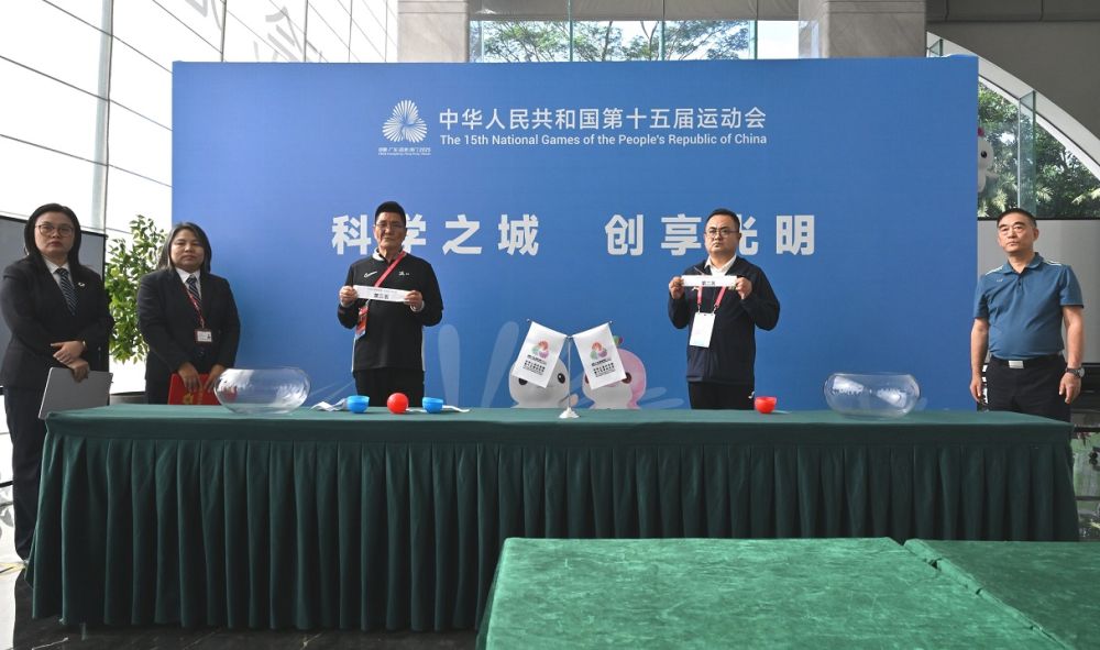 6日,浙江隊(duì)領(lǐng)隊(duì)許德明(右三)和新疆隊(duì)領(lǐng)隊(duì)張?jiān)讫垼ㄓ叶┰谏钲谑泄C處工作人員和足球項(xiàng)目社會(huì)監(jiān)督員的監(jiān)督下展示抽簽結(jié)果。新華社記者 李賀 攝